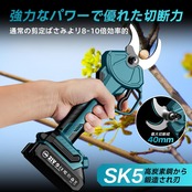 【SK5 ブレード&ナイフサイズ変換可能】このコードレス剪定鋏は SK5 ⾼炭素鋼から鍛造され、湾曲したデザインと組み合わされることで、⽊の枝を滑らかかつきれいに切断できます。ナイフサイズには 10mm、15mm、25mm、40mm の 4 つのモードがあり、初回起動時は 40mm の⼤きな剪定径で設定されており、電源ボタンを押すだけで、モードを切り替えることができます。(注:❶引き⾦と電源ボタンを同時に押さないでください。❷モードを切り替える際には、引き⾦を引かず、電源ボタンのみを押してください。)