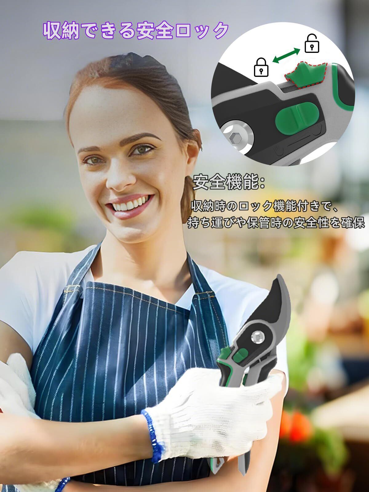 収納できる安全ロック: 枝切りハサミは内蔵スプリング設計を採用しており、スプリングの脱落や剪断破壊の発生を効果的に防ぎます。刃先を閉じて収納できる安全ロックが付きます。剪定の後、はさみを閉じる際には、ワンタッチで親指でスライドさせるだけでロックをかけることができます。安全ロックは怪我を避けるためにはさみを保管するのにも役立ちます