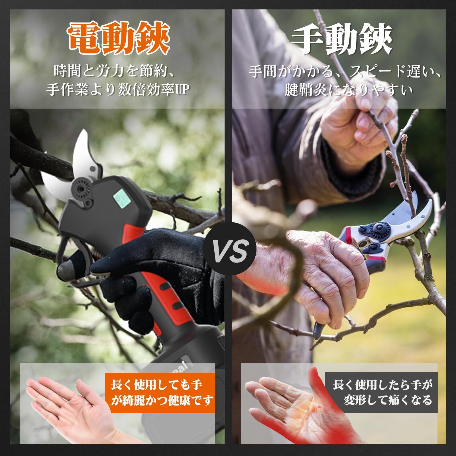 【幅広い用途&アフタサービス】充電式剪定ばさみは、庭木の剪定、造園作業、伐採や刈り枝の処理には抜群の作業能力で欠かせなくなります。腕、肩への負荷が小さく、園芸作業を楽にします。ご家族やお友達やご大切な方へのギフトとしては最高です。本体は1年保しょうあり、日本語取扱説明書もあります。ご購入後、何かご不明な点がございましたら、お気軽にお問い合わせください。
