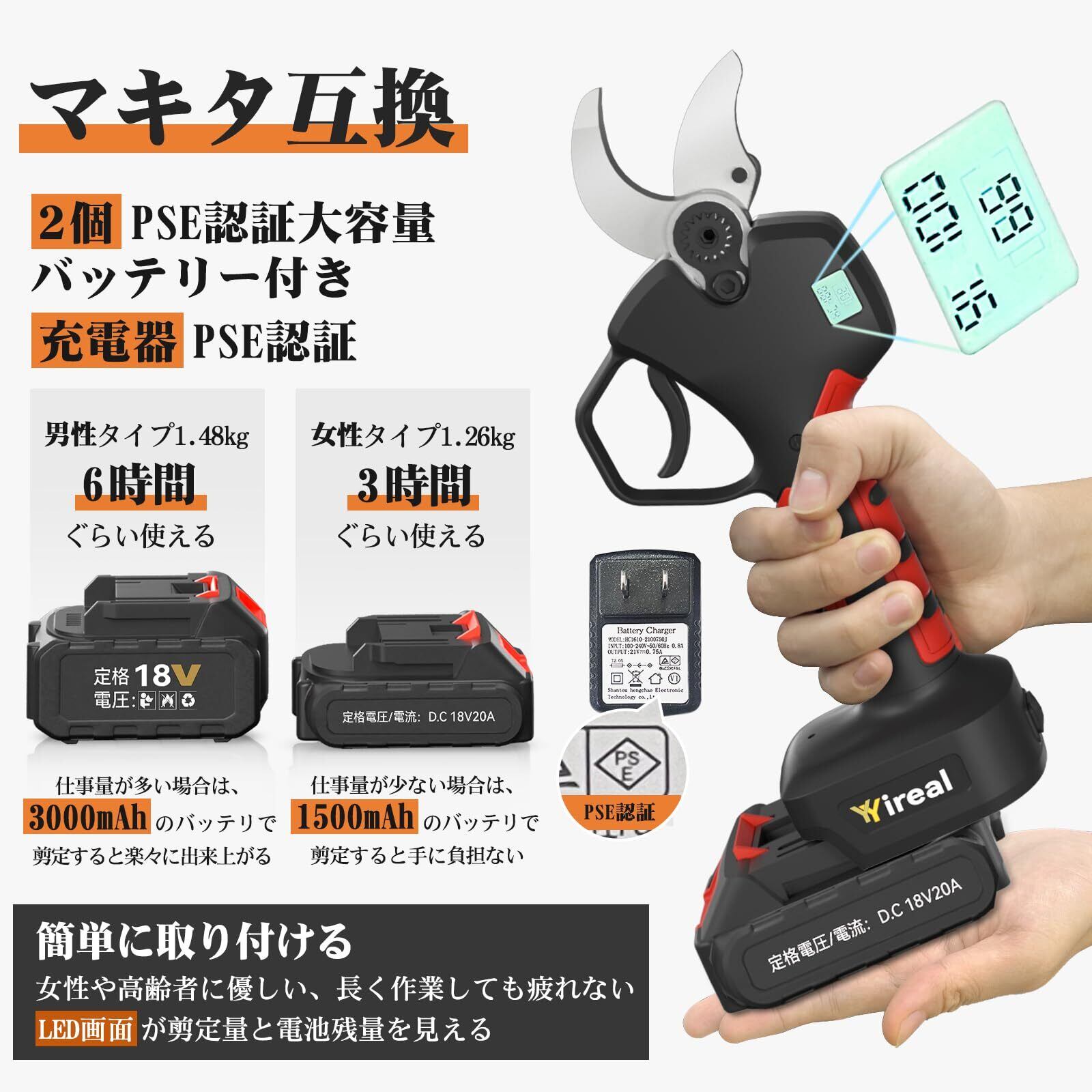 【PSE認証取得&マキタ18Vと互換】この充電式剪定は人間工学に基づき軽くて持ちやすいタイプです、女性や力が小さい方のために二種類のバッテリー用意しています。女性タイプは電池を含めて1.26㎏1500mAhで3時間ぐらい連続切断でき、男性タイプは1.48㎏3000mAhで6時間ぐらい連続切断できます、4500mAh大容量なので一日の仕事に充分対応できます。バッテリーは既にPSE認証取得済なのであんぜんにご使用できますし、マキタ18Vバッテリーと互換できるし、非常に便利です。