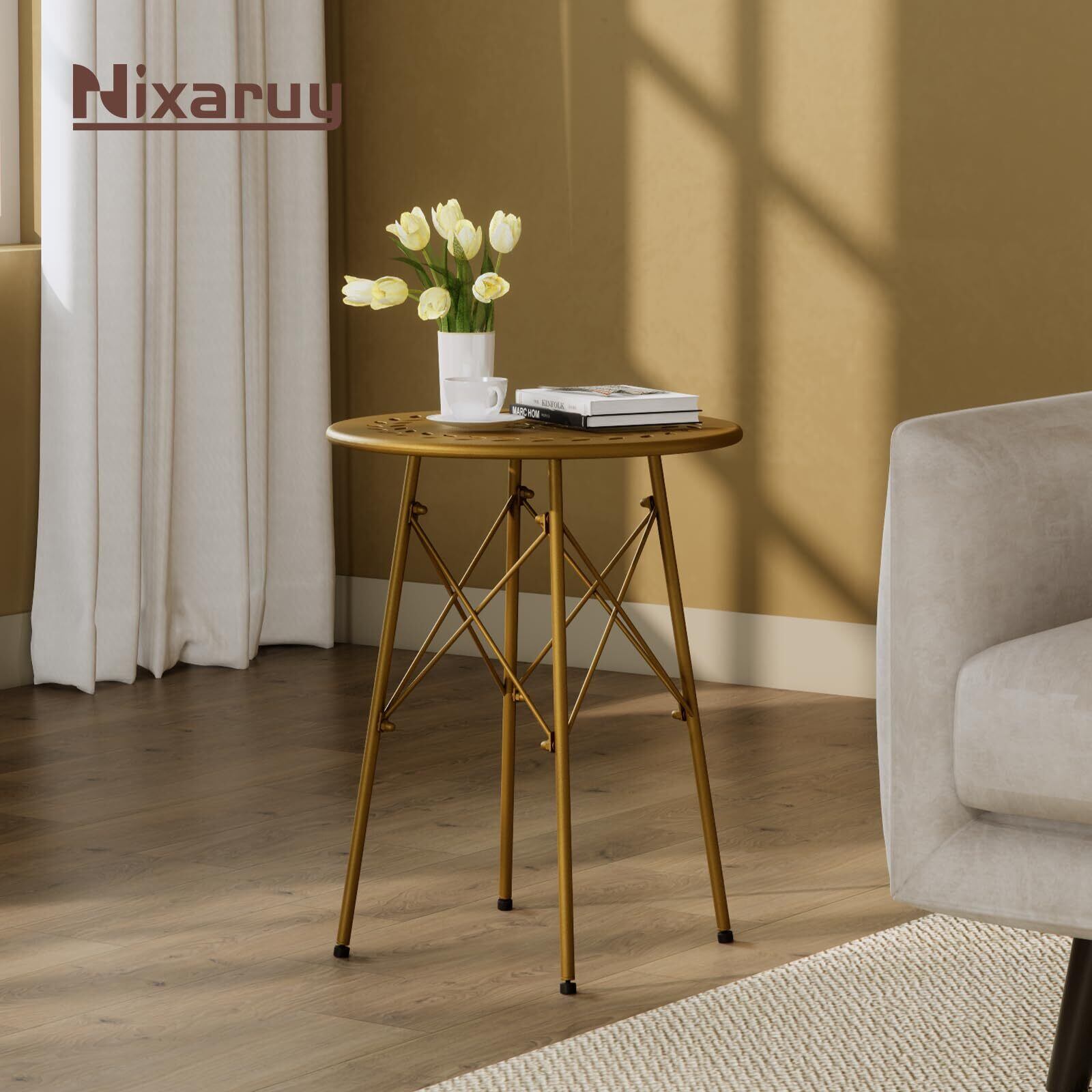 客厅边桌 屋外 テーブル、小型アウトドア テーブル、ガーデンテーブル、円形パティオベランダ テーブルメタル、耐候性、パティオ、庭、バルコニー、庭用の小型アクセントサイドテーブル (ゴールド) | 毎日発送✿はなまる
