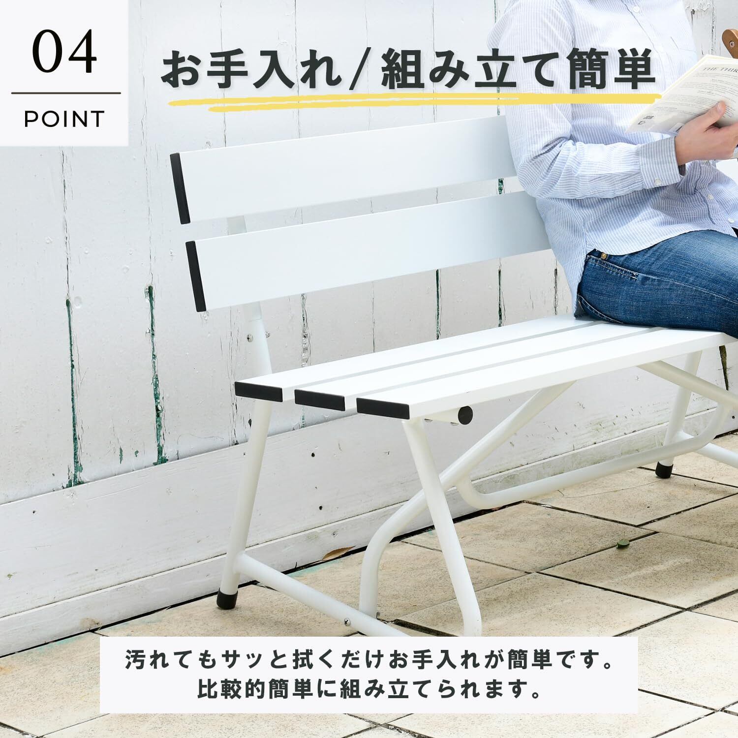 【特徴】おしゃれでお手入れが簡単なアルミ製ガーデンベンチです。雨風に強いアルミ製で錆びにくく、耐久性に優れています。汚れもサッと拭き取れるので、お手入れも簡単です。シンプルなデザインでベランダやバルコニー・お庭など場所を選ばず設置できます。大人2人がゆったり座れるサイズで、休憩所などのベンチとしても最適です。シンプルで耐久性に優れているので、お家だけでなくテニスコートや休憩スペースなどの様々なシーンでも活躍します。