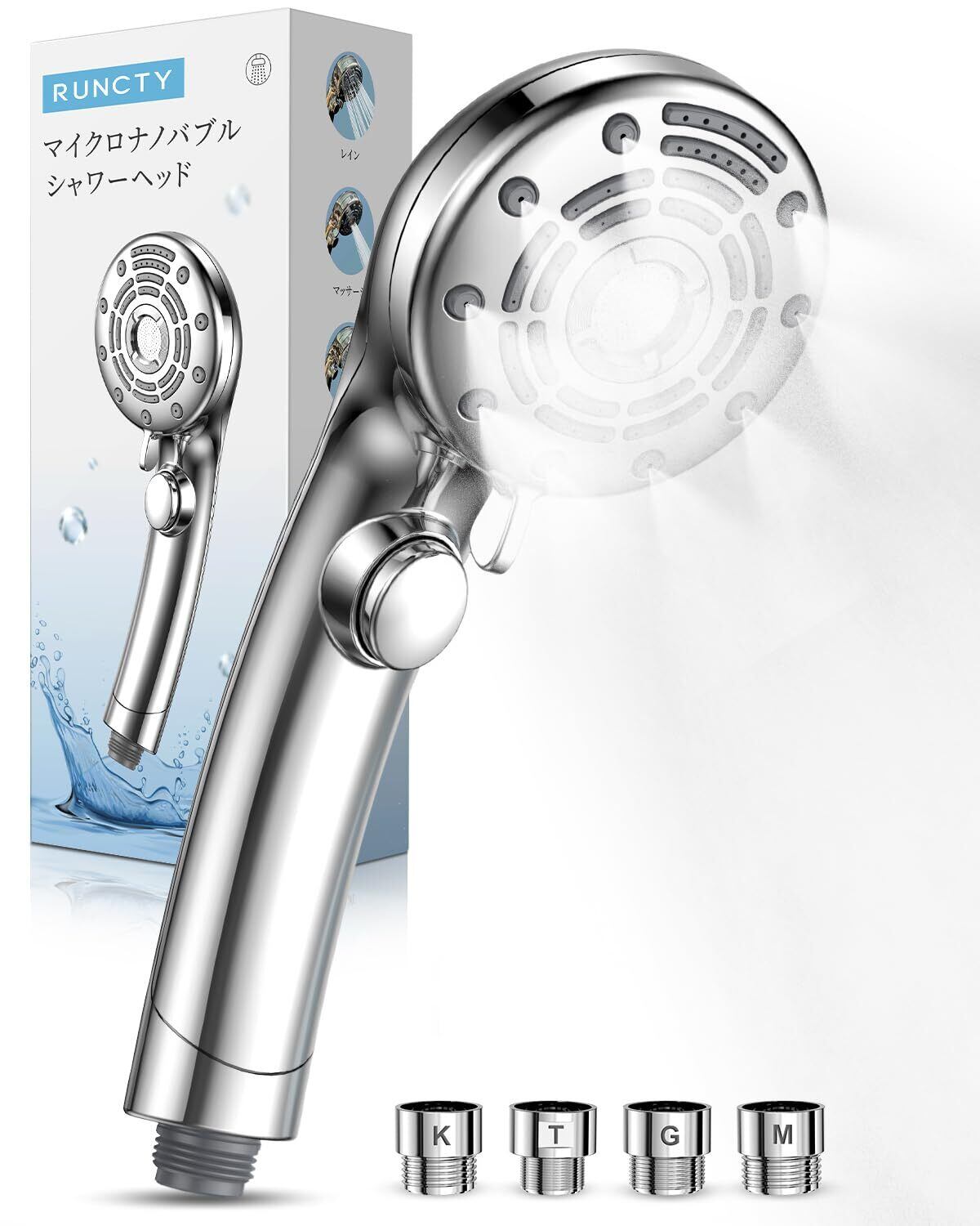 RUNCTY シャワーヘッド マイクロナノバブル【6段階水流・肌奥までに浸透超微細泡・高洗浄とともに超節水】ミストシャワー ヘッド ナノバブル 手元止水 極細水流 肌ケア 美髪 毛穴汚れ除去 頭皮に肌に優しい 節水87%以上 高水圧 保温 うるおい お手入れ・取り付け簡単 国際汎用基準ジョイント 4種類アダプター付き(シルバー)