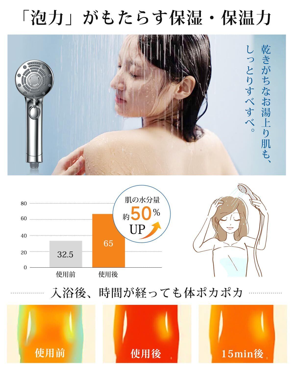【目に見えないナノバブル&ポカポカ・うるおいで満たされた肌へ】:本シャワーヘッドは先進のナノ技術を駆使し、水流を目に見えない超微細なナノバブルに変え、美肌・美髪効果に優れたナノバブルを最大約12億放出!肌に深く浸透し、通常の水では落としきれない汚れや油脂を徹底的に除去し、肌の乾燥や粗さをより改善!さらに、普通の気泡と違い、ウルトラファインバブルにてある程度で水温を保つできますので、お風呂時間をより長く楽しめ、肌の水分をしっかりと保持、うるおいと滑らかさを持続し、長時間の入浴で一日の疲れを癒せ、肌を生まれ変わらせるSPA体験となります!