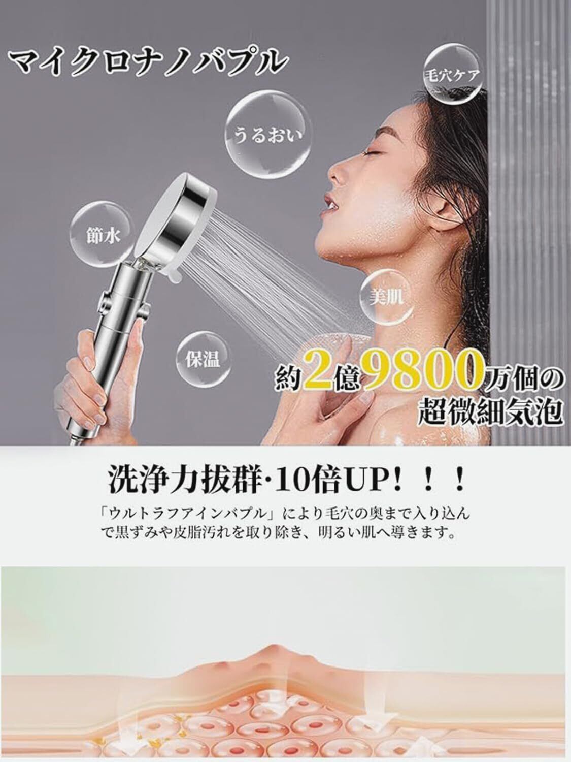 【マイクロナノバブル&高洗浄力】バブル数最大で4億9800万個に達して水を超微細な泡に変えられて、通常の水よりも優れた洗浄力で、肌の毛穴の汚れや化粧品などを効果的に取り除き、つややかな肌を実現できます。水流モード調整方法:側のスイッチで水流の穴、水流量をコントロールでき、レインモード、マッサ一ジモ一、ミストモード、水流モードなどを実現できます。