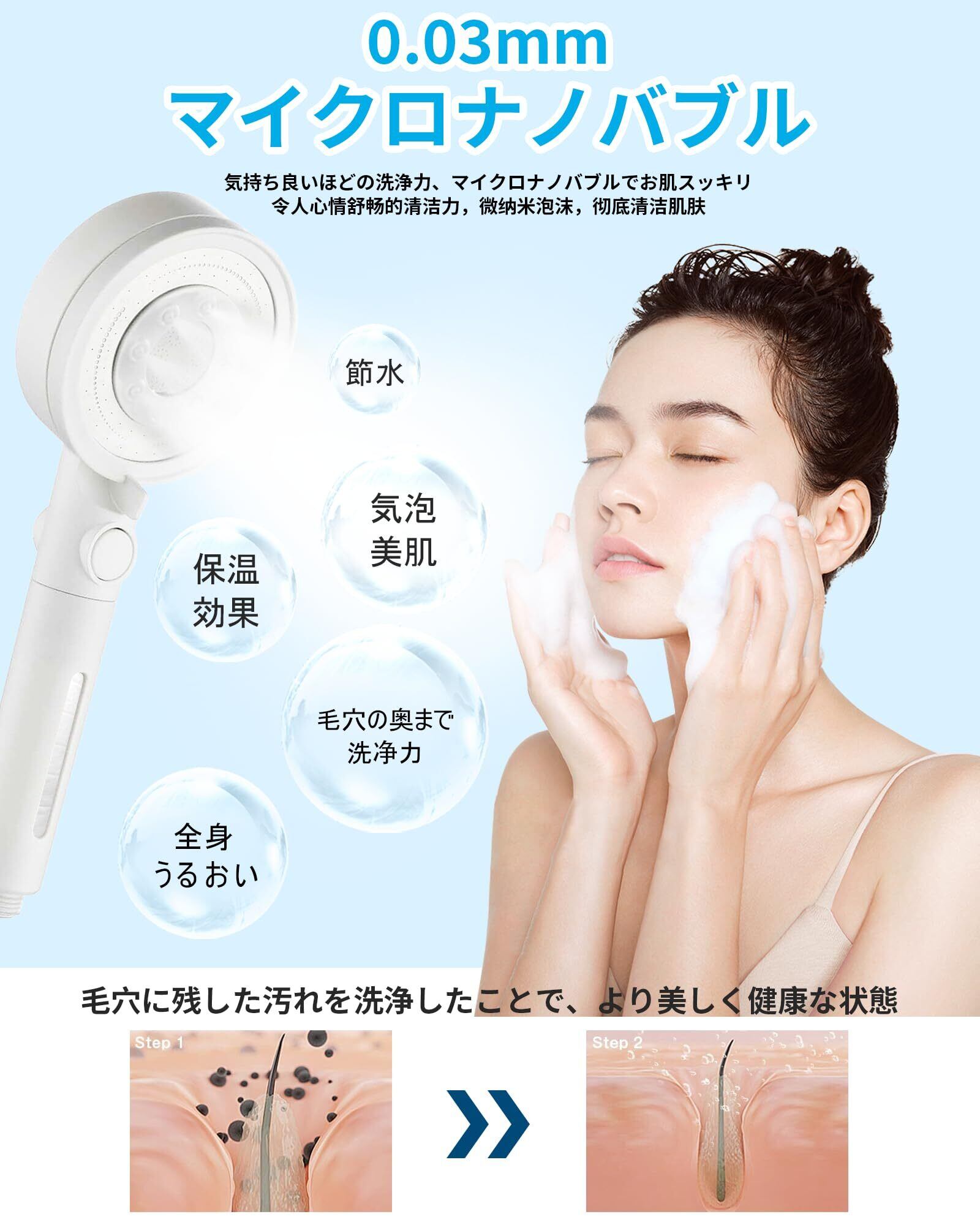 【極細水流・美肌可能】本製品は、0.03mmの超微細孔と特殊構造のマイクロバブルにより、毛穴の奥の汚れや臭いを 除去します。お肌や頭皮の汚れを洗い流します。ミストは肌の奥深くまで浸透し、内側から外側まで肌を潤わせ続けます。肌や髪に優しいしゃわーへっどで、お肌も敏感な方やお子様でも安心してお使いいただけます。