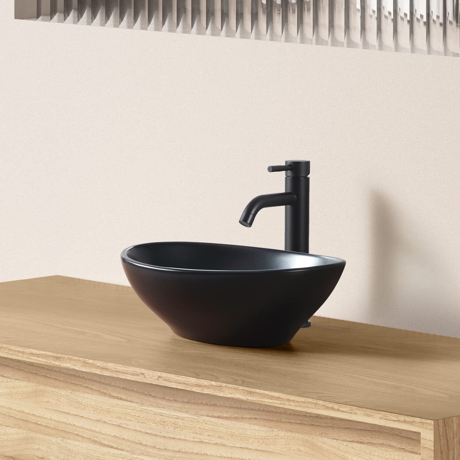 【混合水栓付き】ブラック 洗面ボウル 楕円形 410*340*145mm 手洗いボウルセット おしゃれ 洗面ボール 置き型 洗面台 手洗い鉢 陶器