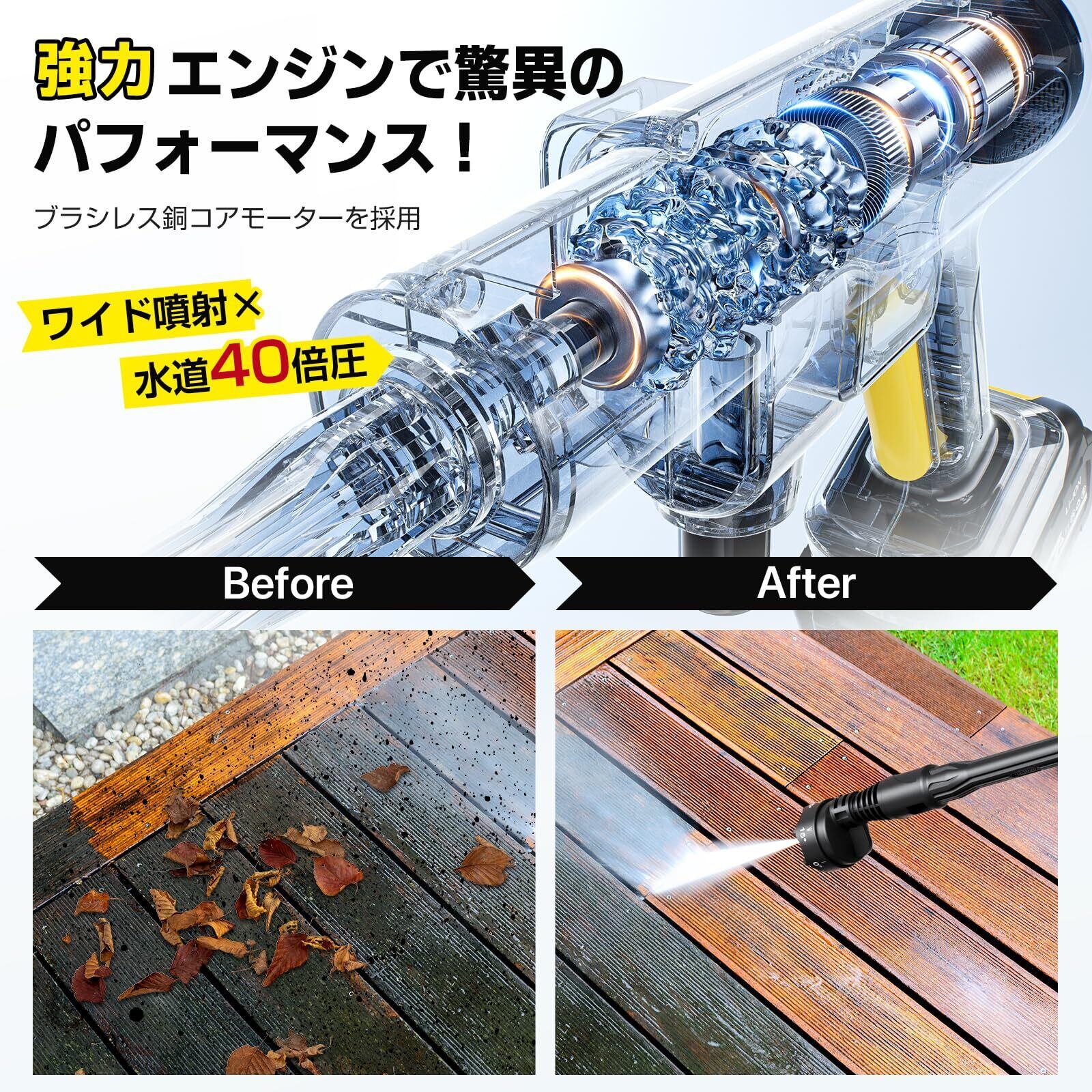 【洗車や大掃除に便利&調節可能】高圧洗浄機は高圧ポンプと高効率の750W純銅ブラシレスモーターを搭載し、水道水の40倍の圧力まで安定した強力な水圧を提供し、高圧噴射による頑固な汚れを簡単に除去します。他社製品に比べ、洗浄機は圧力が20%高いため、洗車時間が10分以上短縮され、効率的な洗浄が可能です。高圧洗浄機は一目でわかるディスプレイ画面搭載、画面の表示により、モード調整や電池残電確認ができます。ハイパワーが実現され、しかも省エネ!低騒音デザインの高圧洗浄機で、水圧を調節できる家庭用モデルなので洗車だけじゃなくさまざまな汚れをラクに掃除!2段階水压モードがあり、射程は最大10メートル、強力な水圧によって、長年蓄積したガンコな汚れを落とすことにもできます。 弾力性があるので洗浄作業中も楽々給水ホースに専用フィルターを利用し、ゴミなど不純物の混入を防ぎます。