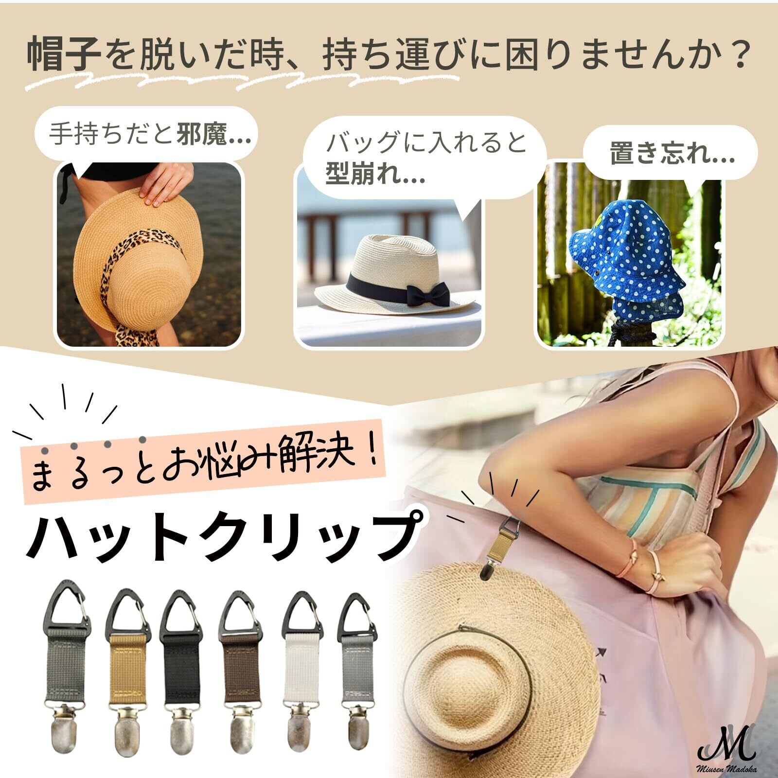 【使用方法】帽子止めクリップの使い方は簡単です。クリップ部分を帽子のつばに挟み、もう一方の端をバッグのストラップなどに固定します。これにより、風が吹いて帽子が飛ばされても、クリップによって帽子が保持されます。ハンディタオルなども留めておけます。