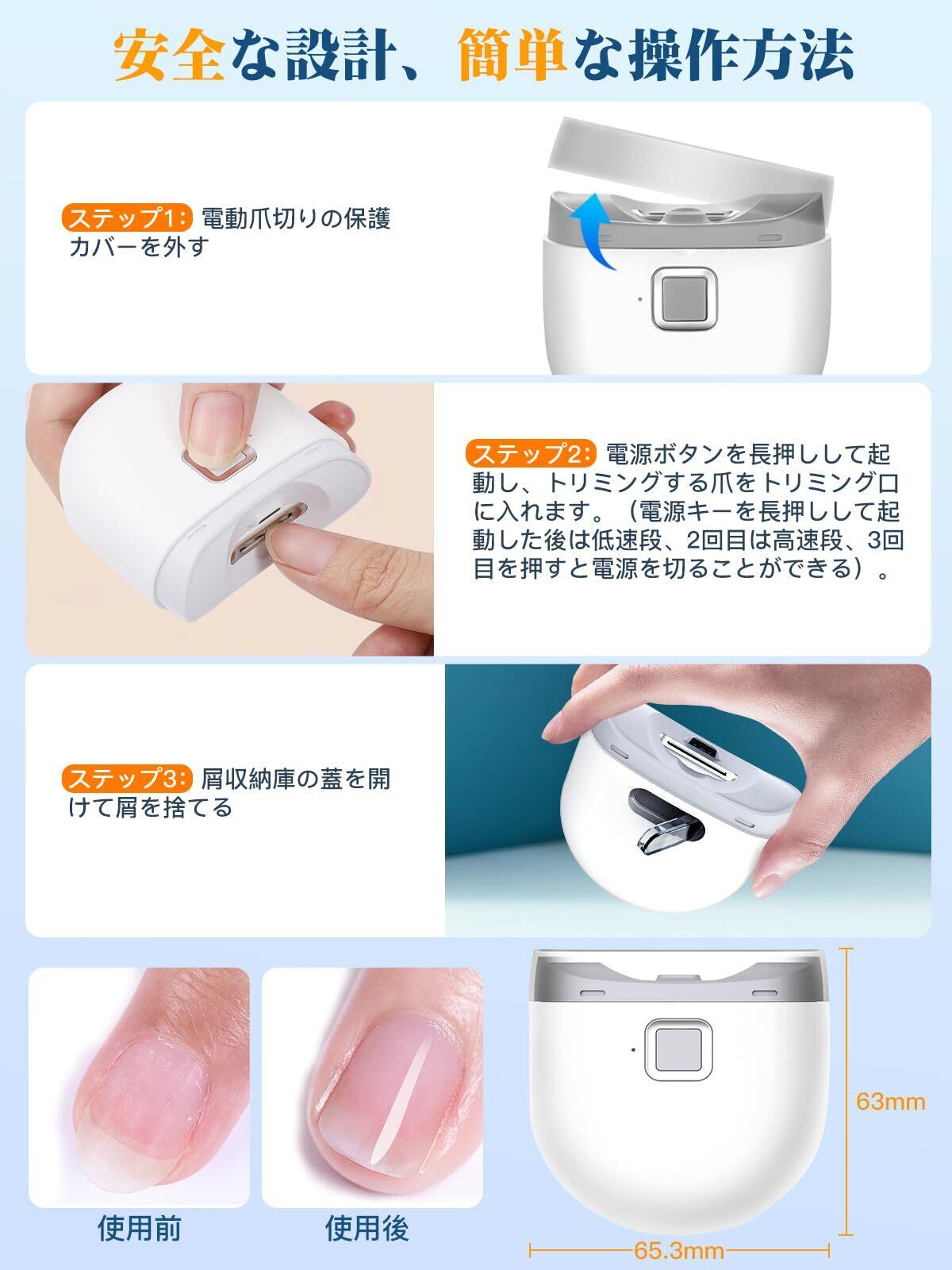 【多段速度調整、安全挟み込み防止機構】さまざまなタイプの爪や個人の好みに応じて、さまざまなトリミングのニーズに適応し、最高の使用体験をするために複数の速度オプションが提供されます。カッターヘッドのエッジは丸みを帯びており、爪の周りの皮膚への刺激を軽減し、より快適なトリミング体験を提供します。カッターヘッドのエッジは丸みを帯びており、爪の周りの皮膚への刺激を軽減し、より快適なトリミング体験を提供します。