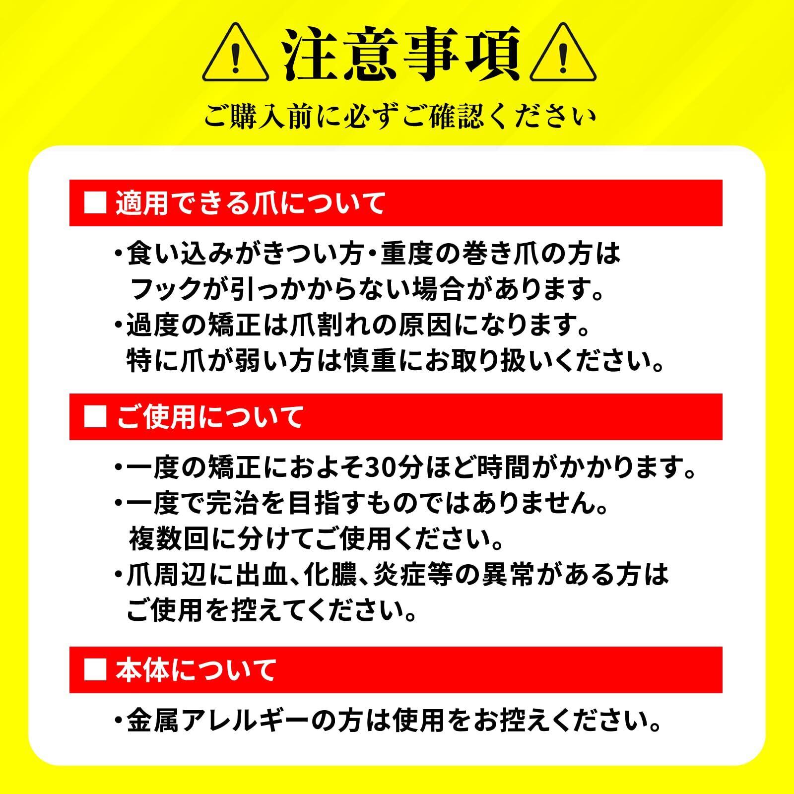 【使用上の注意】●重度の巻き爪や爪周辺に炎症、出血がある場合は使用を控え、専門医にご相談ください。●一度の矯正で完治を目指すのではなく、複数回に分けて矯正してください。●過度な矯正は爪割れの原因となるため、適切な力加減で使用してください。●金属アレルギーの方はご使用をお控えください。