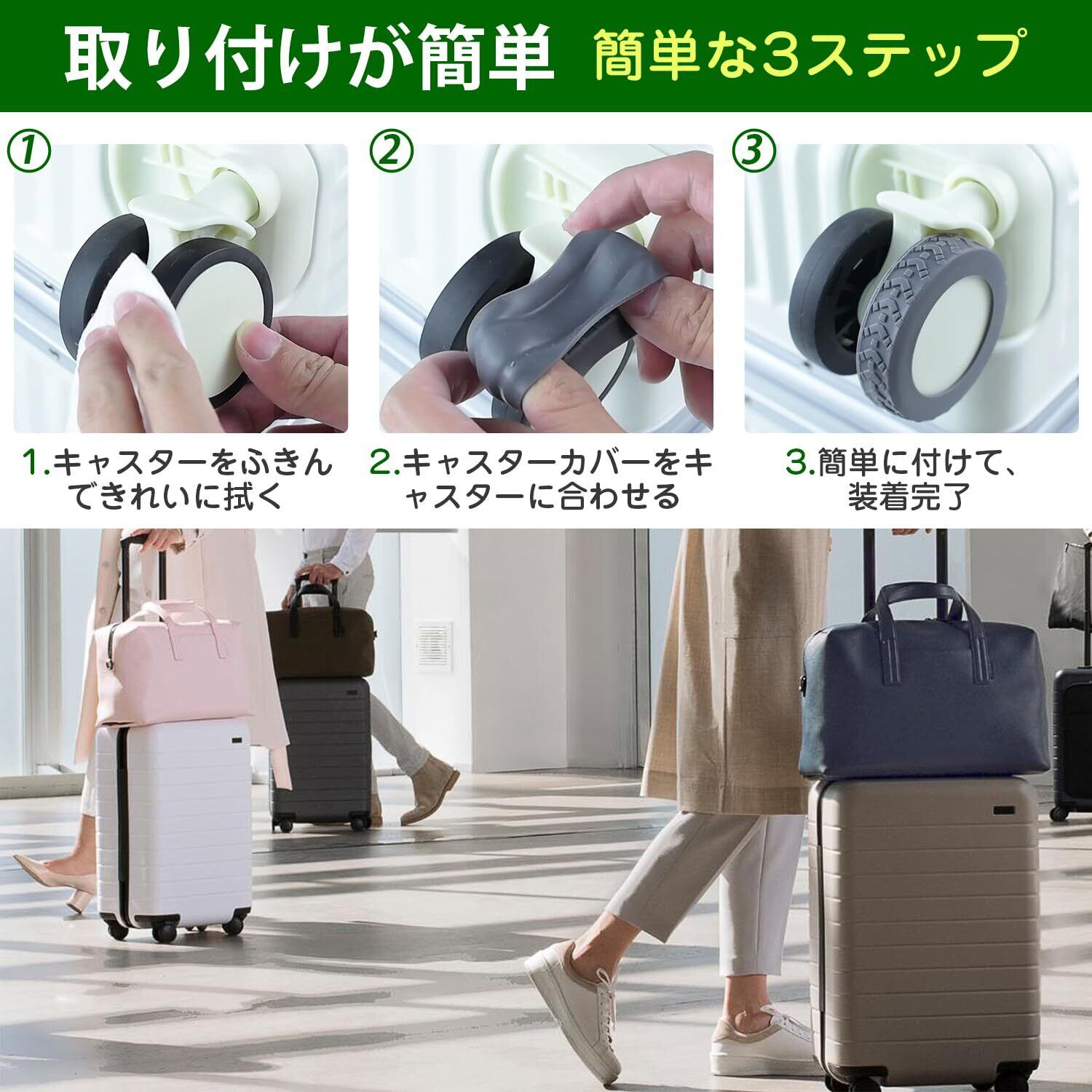 【簡単な取り付けと洗浄】ホイールを外さなくても取り付けることができ、数秒で取り付けが完了します。使用後、丁寧に水洗いし、陰干しすれば使い続けます。また、キャスターを室外に使用した后、カバーを取り除くことで、スーツケースの汚れを室内持ち込まないようにできます。さまざまな色の選択肢があり、スー茨ケースの個性化と美観を高めることができま