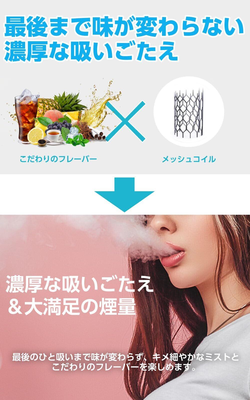 【吸引回数】本商品は1本で約2500回の吸引が可能。紙たばこに換算すると、なんと!約250本(12.5箱)分の吸引量となります。こだわりのフレーバーとメッシュコイル採用により吸引ができなくなるまで風味を損ないません。