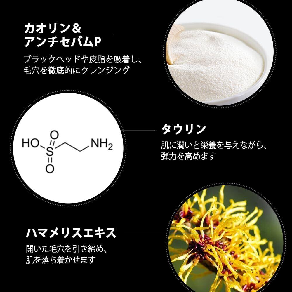 [毛穴の奥までケア] : カオリンとアンチセボムP成分がブラックヘッドと皮脂を吸着し、毛穴の奥の老廃物をスッキリ除去。ウィッチヘーゼルエキスと毛穴収れん成分がたるみ毛穴を弾力ケアします。