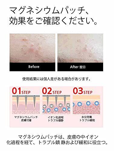 【マグネシウム ニキビパッチの使い方】①しっかりと洗顔をしてください。②パッチ部分に手が触れいないようにフィルムを剥がします。 ③ニードル部分が肌に接するように貼ります。 ③2時間~8時間後に剥がします。