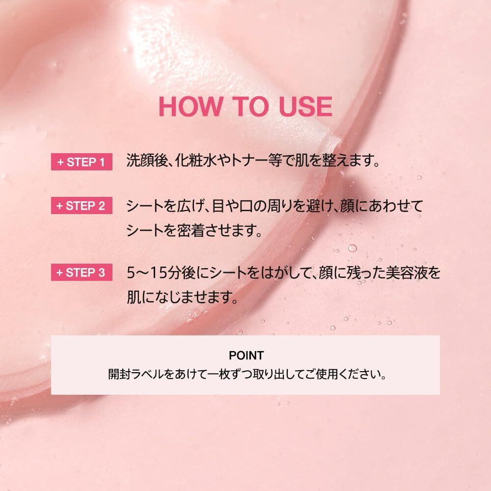 ピンセット付きでさらに衛生的で簡単に使用することができます。使用方法:1.洗顔後、化粧水等で肌のキメを整えます。2.シートを広げ、目と口の位置に合わせ隙間なく密着させます。3.5~15分後にシートをはがし、手のひらでハンドプレスしながら肌に残った美容液をなじませます。