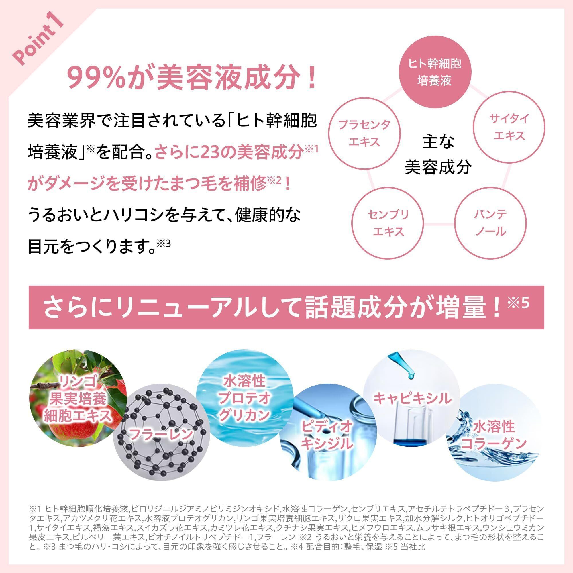 ヒト幹細胞 培養液*、コラーゲン*、ヒアルロン酸*など23種類の美容成分を配合した まつ毛美容液 。 敏感肌 の方でも安心してご使用いただけるやさしい設計です。 *配合目的: 保湿