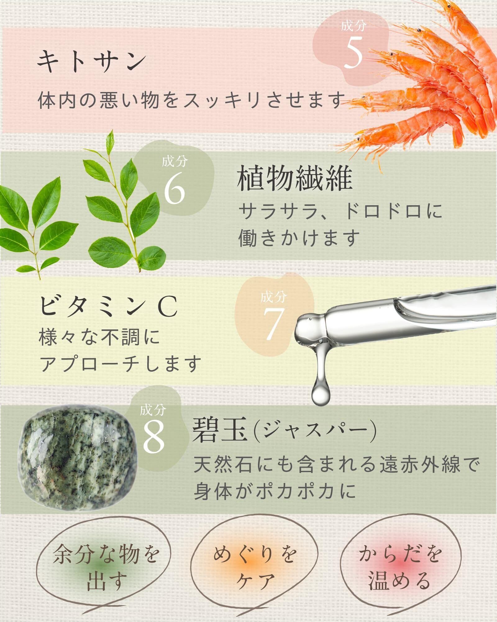 【8つの天然成分配合】木酢末、竹酢末、どくだみ末、ビワ末、キトサン、ビタミンC、碧玉パウダー、食物繊維をベストバランスで配合しています。