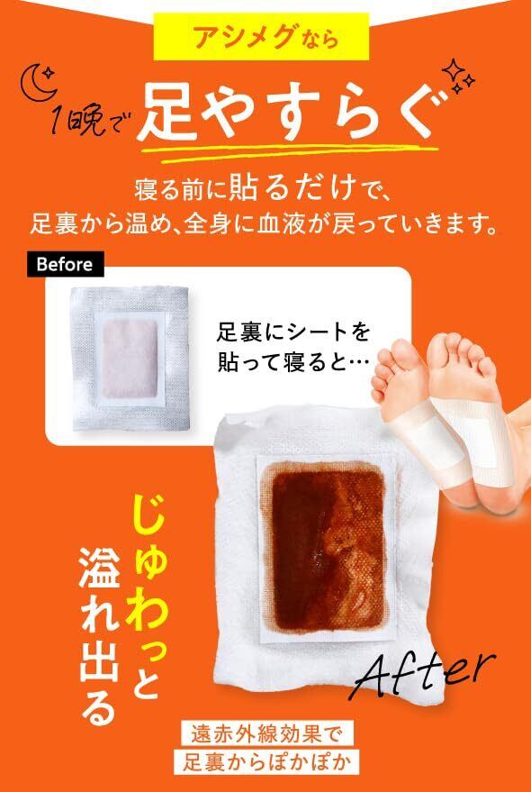 ・使い方は簡単な2ステップ。寝る前に足裏に貼り付け、翌朝剥がすだけで、手軽に利用できます。