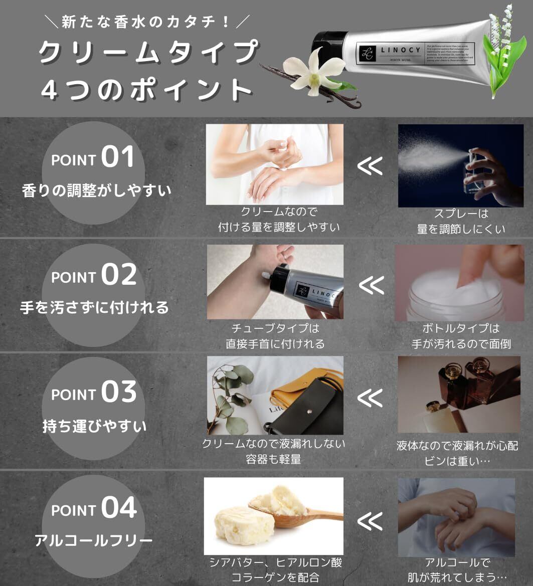 クリーム状の香水なので量の調節がしやすく、持ち運びもしやすい。