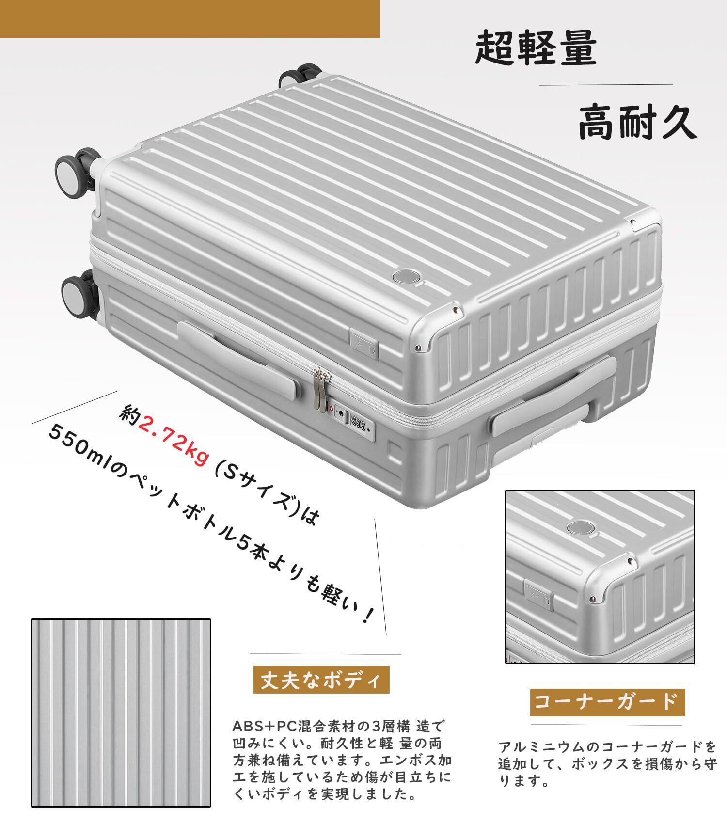 【サイズ】Sサイズの外寸は55*36.5*22.5cm、重さ:2.72kg 超軽容量、は33リットル、1~3泊に似合います。Sサイズは3辺全長114cmで機内持ち込み可能です。Mサイズの外寸は65*42.5*26cm、3辺の合計は133.5cmです、重さ:3.37kg 、容量は55リットル、4~7泊以上。Lサイズの外寸は72*47.5*29cm、3辺の合計は148.5cmです、重さ:3.99kg、 容量は85リットル、7泊以上。