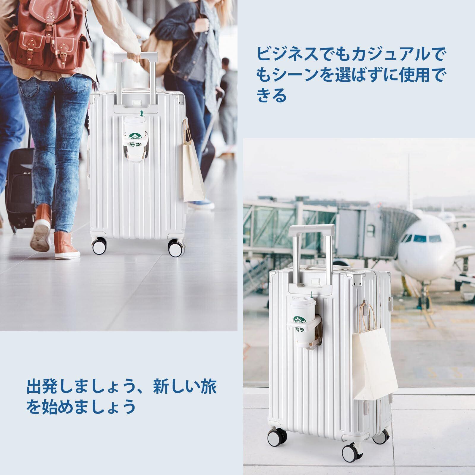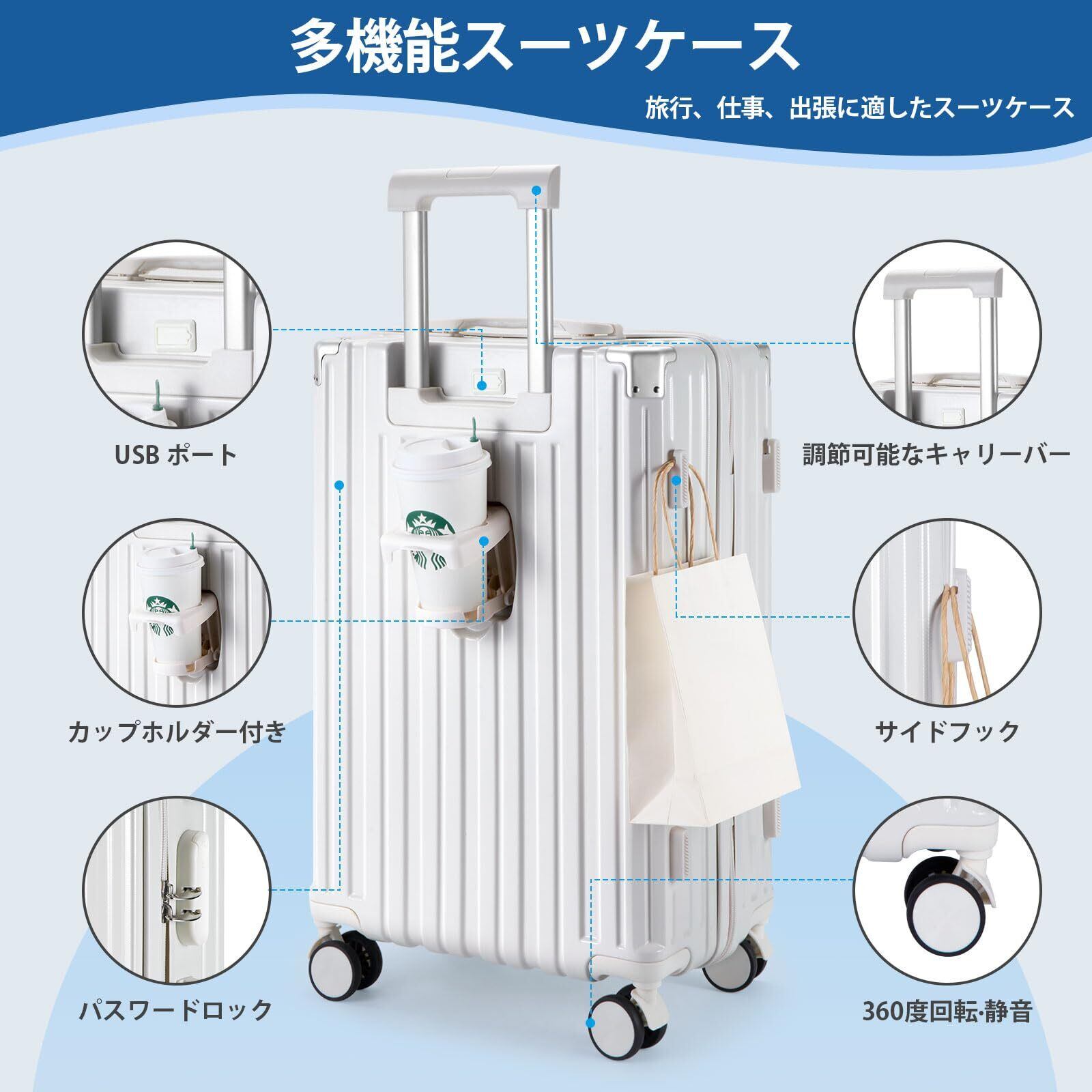 [RoamRover] スーツケース 機内持ち込み キャリーケース カップホルダー付き キャリーバッグ USBポート付き 隠しフック機能 充電機能 大型 静音 ダブルキャスター 耐衝撃 360度回転 軽量 修学 泊まる 旅行 出張 (ホワイト, M (47L/3-6泊)) | 毎日発送✿はなまる