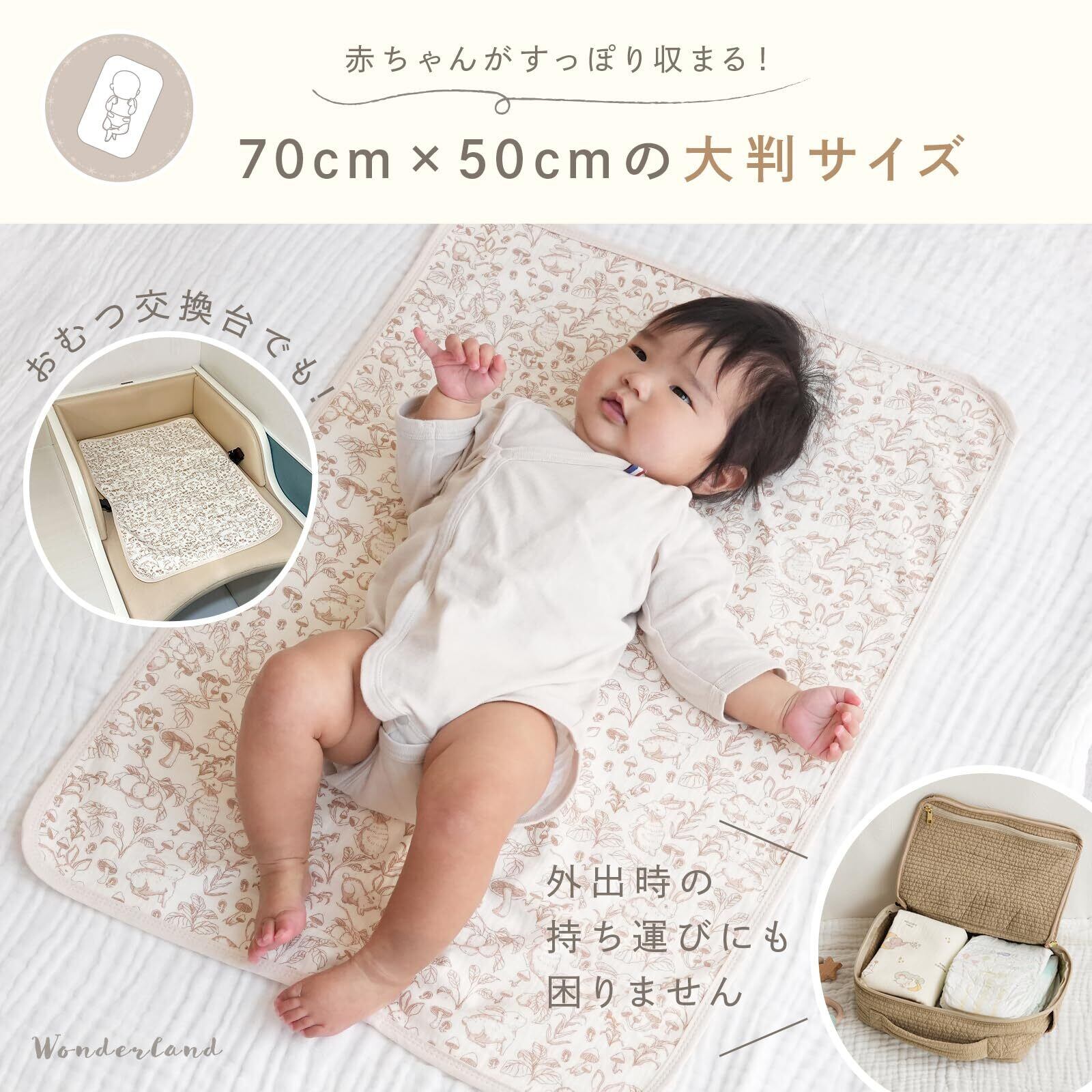 【赤ちゃんがすっぽり収まる大判サイズ】赤ちゃんがすっぽりと収まる「50cm×70cm」の大判サイズ! お出かけ先でのおむつ交換台にもぴったり! 元気でよく寝返りをする赤ちゃんやおむつ替えが苦手な赤ちゃんでもシーツが大きいので シーツから出にくく安心しておむつ替えをしていただけます◎