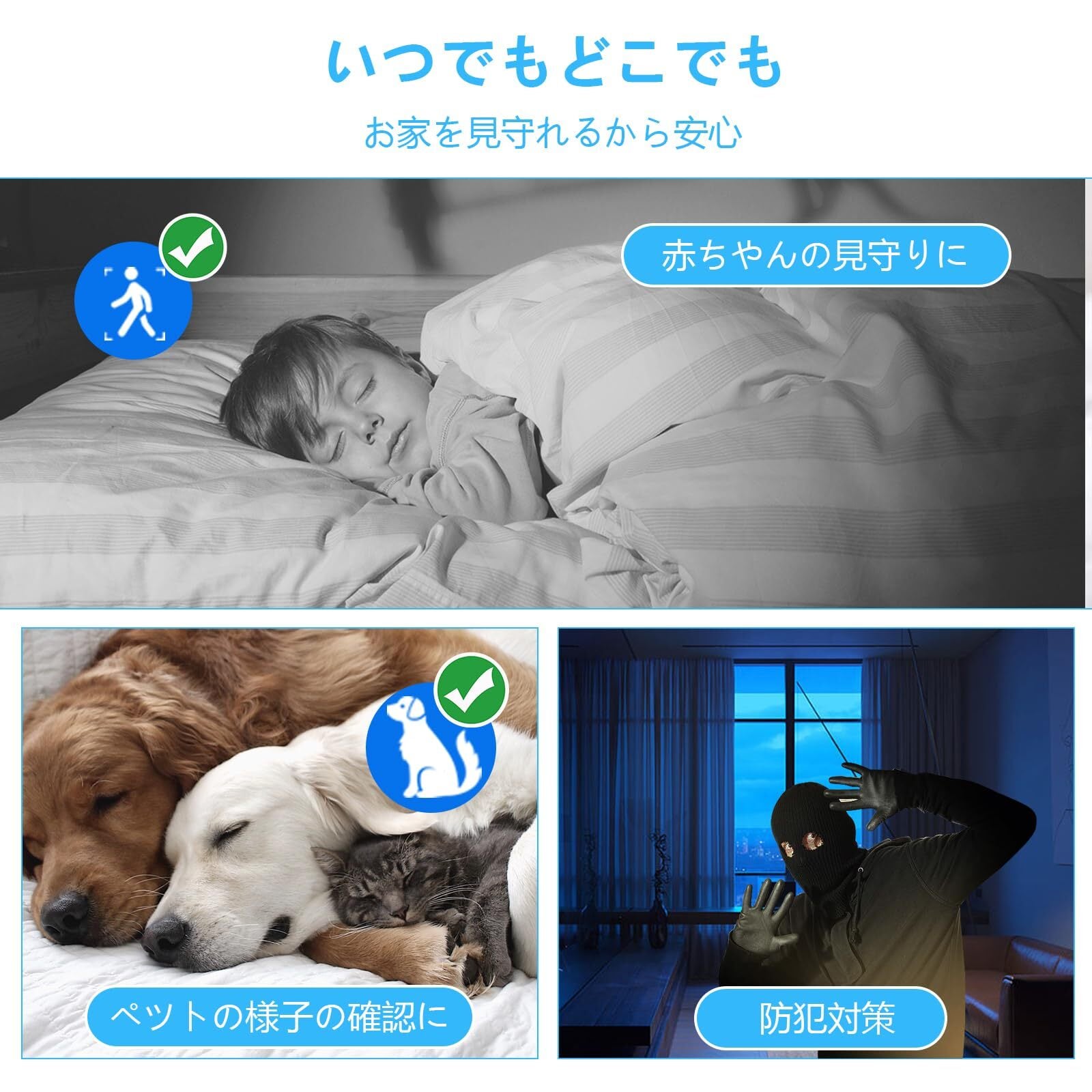 【AI自動追跡&3倍ズーム】人/ペットの動きを高精度検知|異常時は自動追尾で詳細を記録。AI技術で人やペットの動きをリアルタイム検知し、自動追跡&3倍ズームで鮮明に記録。赤ちゃんの寝相やペットの行動を細部までキャッチ,大切な瞬間を逃しません。防犯カメラとしてもペットカメラとしても最適。