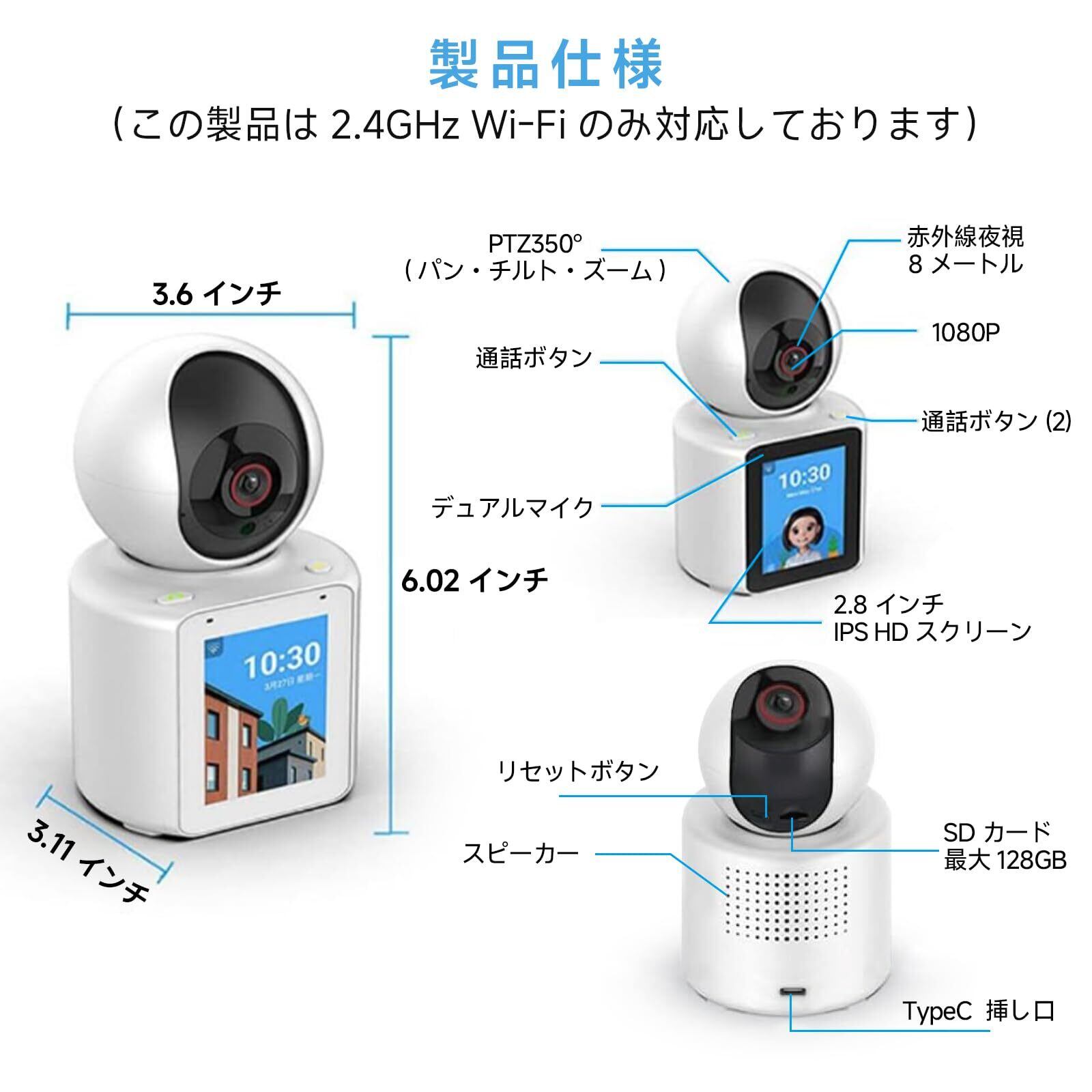 【ワンタッチ通話】 - 携帯電話にアクティブコールを発信できるこのカメラは、緊急時に高齢者や子供たちに便利なソリューションを提供します。カメラの電話ボタンを押すだけで、簡単に家族と連絡を取ることができます。この機能は特にスマートフォンを持っていない親や子供に理想的で、ビデオ通話を通じていつでもつながることができます。