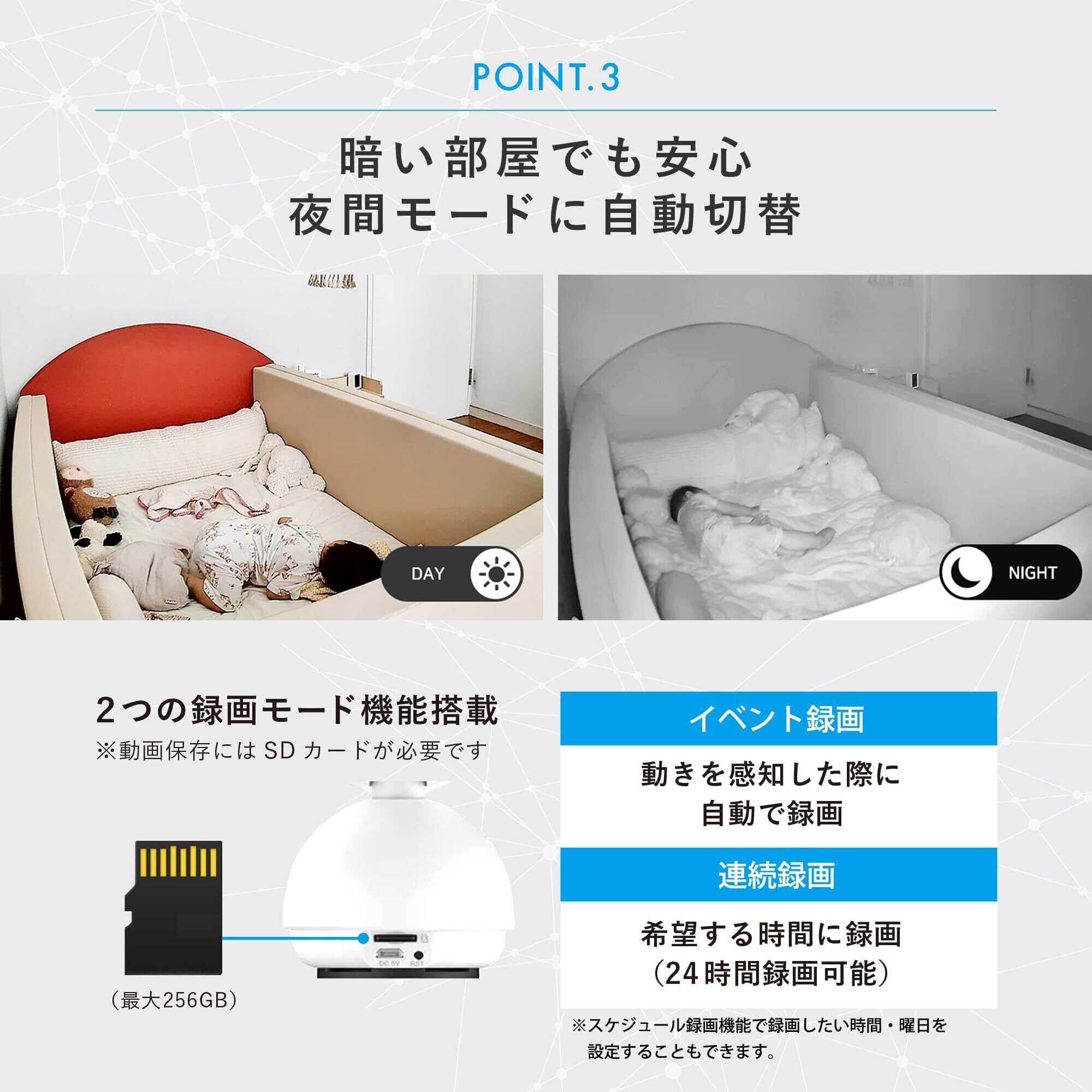 【製品概要】天井・壁・床などいろんな向きで設置可能なみまもりカメラです。 スマートフォンの操作によりカメラを回転させることで360°の視野を確保することができるので、必要な場所をどこからでも確認することができます。夜間モードへの自動切換( IRナイトビジョン機能:自動)搭載で部屋が暗くても安心です。 天井に設置した場合は設定にある基本機能設定で上下を変更することができます。 ※アプリ画面の右上<・・・>➡<基本機能の設定>➡<画面フリップ>をon(丸を右側にスライドさせると背景が緑になる)の設定で画面が反転します。