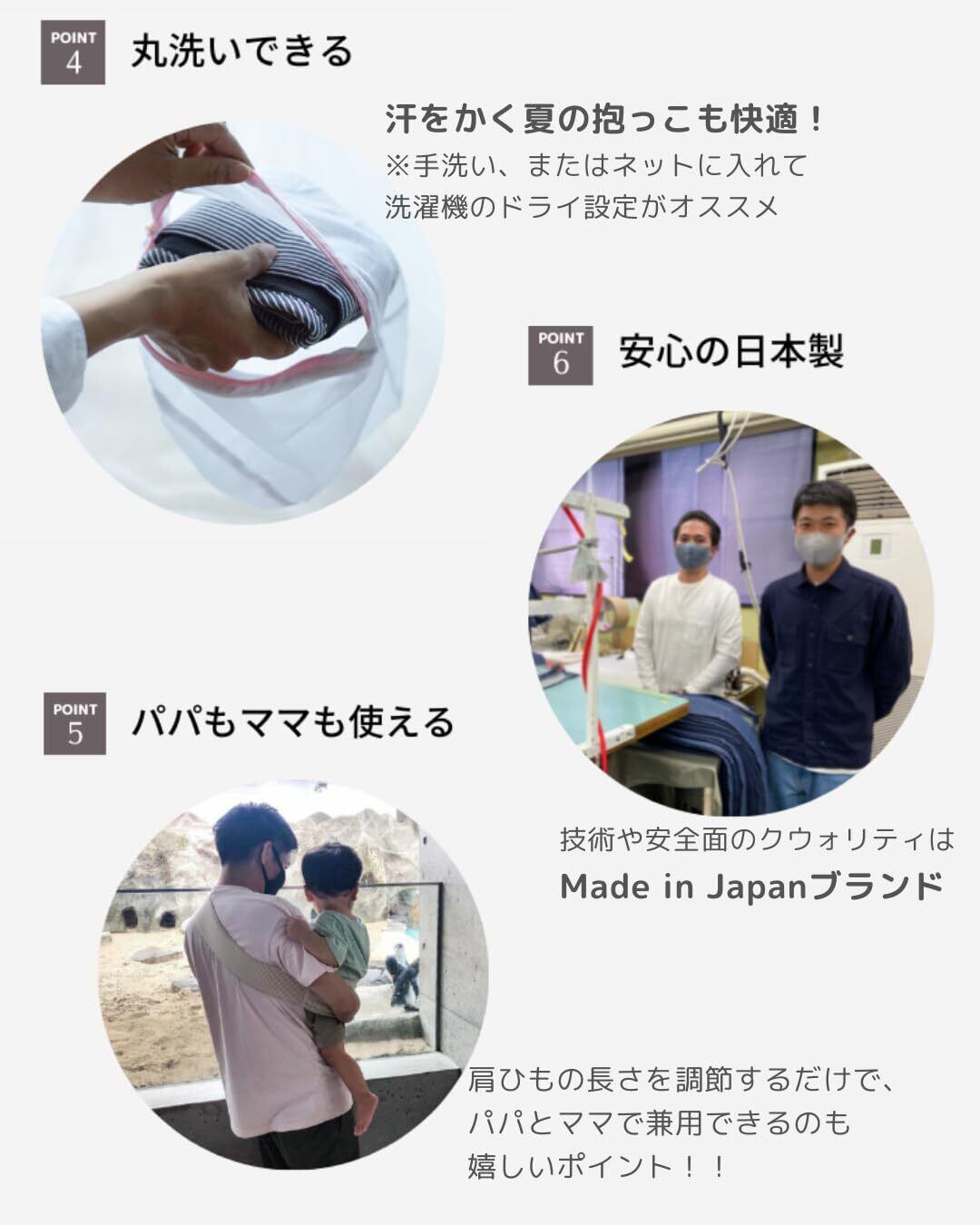 1:ひとりで歩き始めた1歳から4歳までのお子さんの片手抱っこをサポートします。10㎏を超えるお子さんは、両手で抱っこするのでも大変。荷物があるときやお母さんにとっては、特に強い味方です。