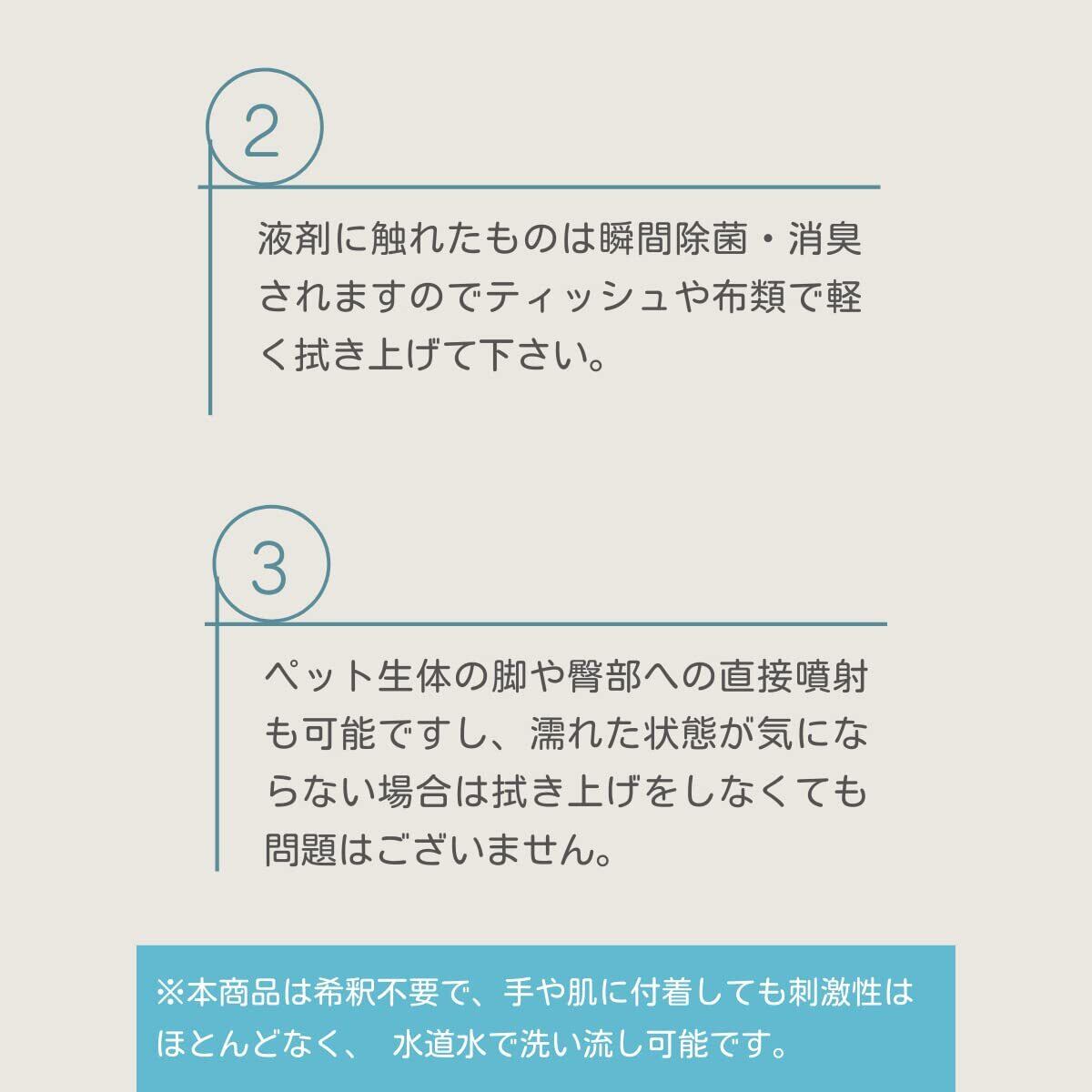 【用途】 一般家庭や動物病院内、 ペットホテル等における除菌・消臭 診察台(犬、猫、小動物等の) 、ゲージ、手術室、待合室等の清掃および除菌・消臭