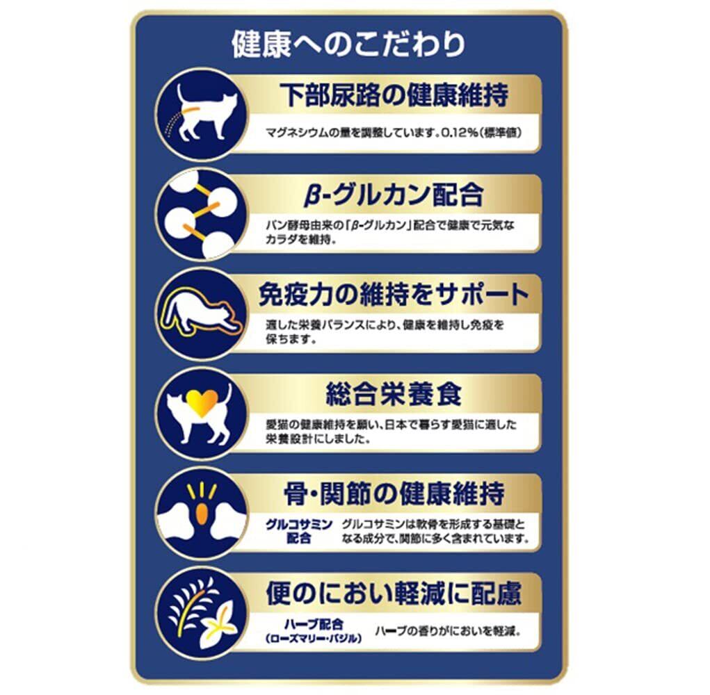 毎日の食事を、すべての猫ちゃんに喜んでもらえるよう考えたミックスタイプのキャットフード。独自の研究・改良の結果、とびっきりのおいしさを実現しています。かつお味をベースに愛猫の大好きな味をミックス、β‐グルカン・グルコサミン・ハーブを配合。猫の下部尿路の健康維持に配慮してマグネシウムを調整。この製品は、ペットフード公正取引協議会の定める分析試験の結果、「総合栄養食/成猫期用」の基準を満たすことが証明されています。