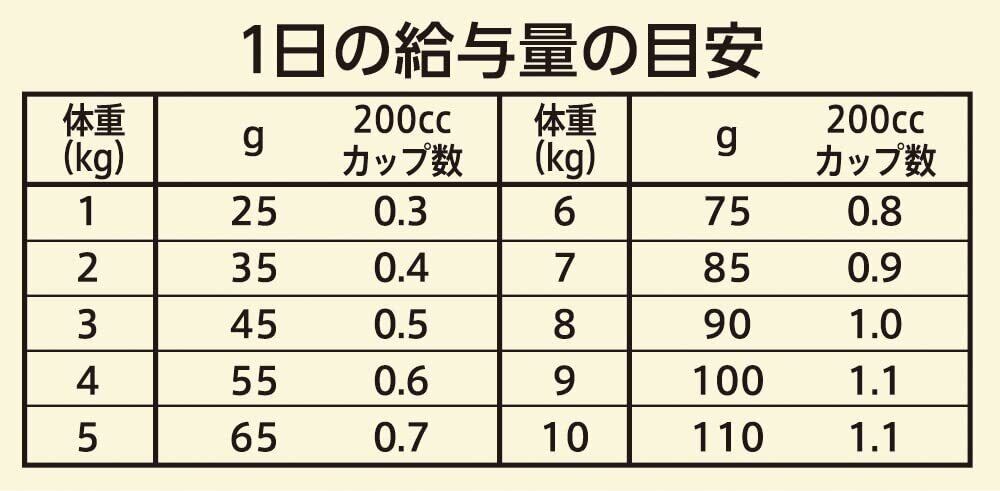 ●給与量 体重1kg:25g(200ccカップ0.3)、2kg:35g(200ccカップ0.4)、3kg:45g(200ccカップ0.5)、4kg:55g(200ccカップ0.6)、5kg:65g(200ccカップ0.7)、6kg:75g(200ccカップ0.8)、7kg:85g(200ccカップ0.9)、8kg:90g(200ccカップ1.0)、9kg:100g(200ccカップ1.1)、10kg:110g(200ccカップ1.2) ●給与方法: ・本製品には、成猫に必要な栄養がバランスよく含まれていますので、本製品と水のみで毎日の食事として十分です。 ・1日の食事量は上記の表を目安に、愛猫の運動量に合わせて与える量を加減してください。 ・1日の食事量を2回程度に分けて与えてください。 ・新鮮な水をいつでも飲めるようにたっぷり用意してあげてください。 ・フードの切り替え、給与量の変更は、徐々に行ってください。 ・カップ数の数値は目安です。