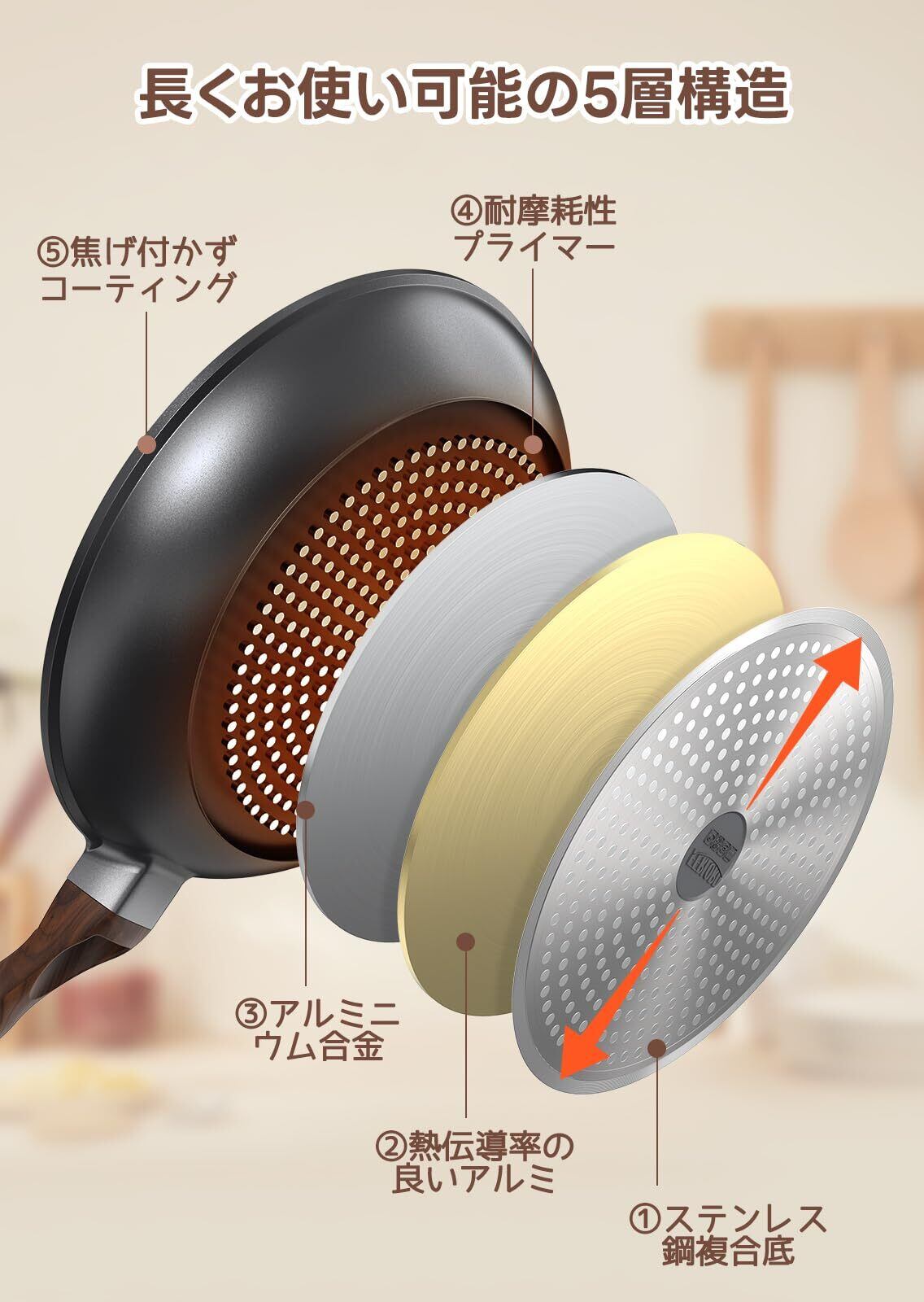 【使いやすいデザイン】 食材がくっつかず、洗いやすい非粘着性能。軽く拭くだけで汚れが簡単に落ち、内面の留め具の凹凸がないため、お手入れが簡単で家事の負担を軽減します。このフライパンは、厳しい耐久性テストに耐えてきた真の勇者。どんな試練でも立ち向かい、その頑丈な実力を発揮しています。キッチンでの激しいバトルにも安心して挑めます。
