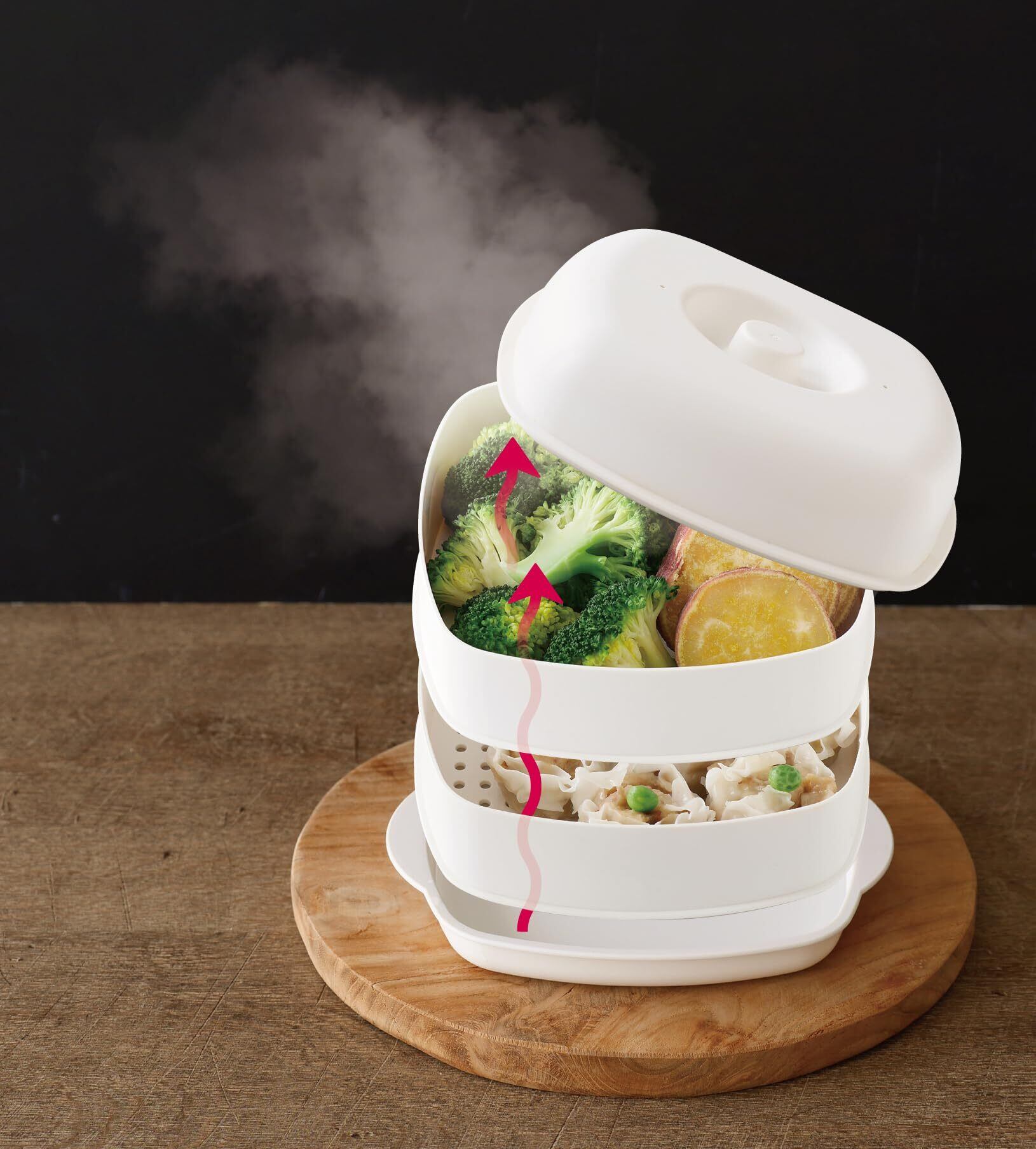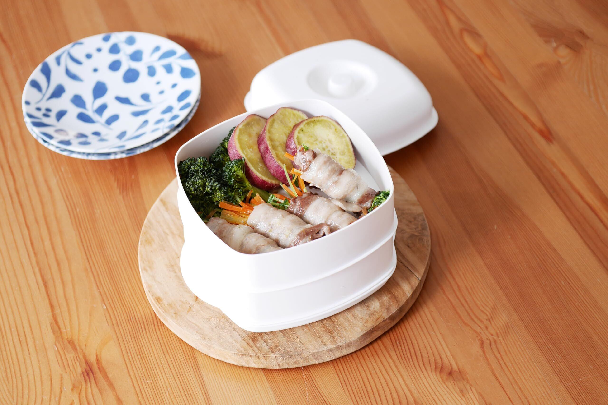 2つの食材を同時に調理できる電子レンジ用せいろです。