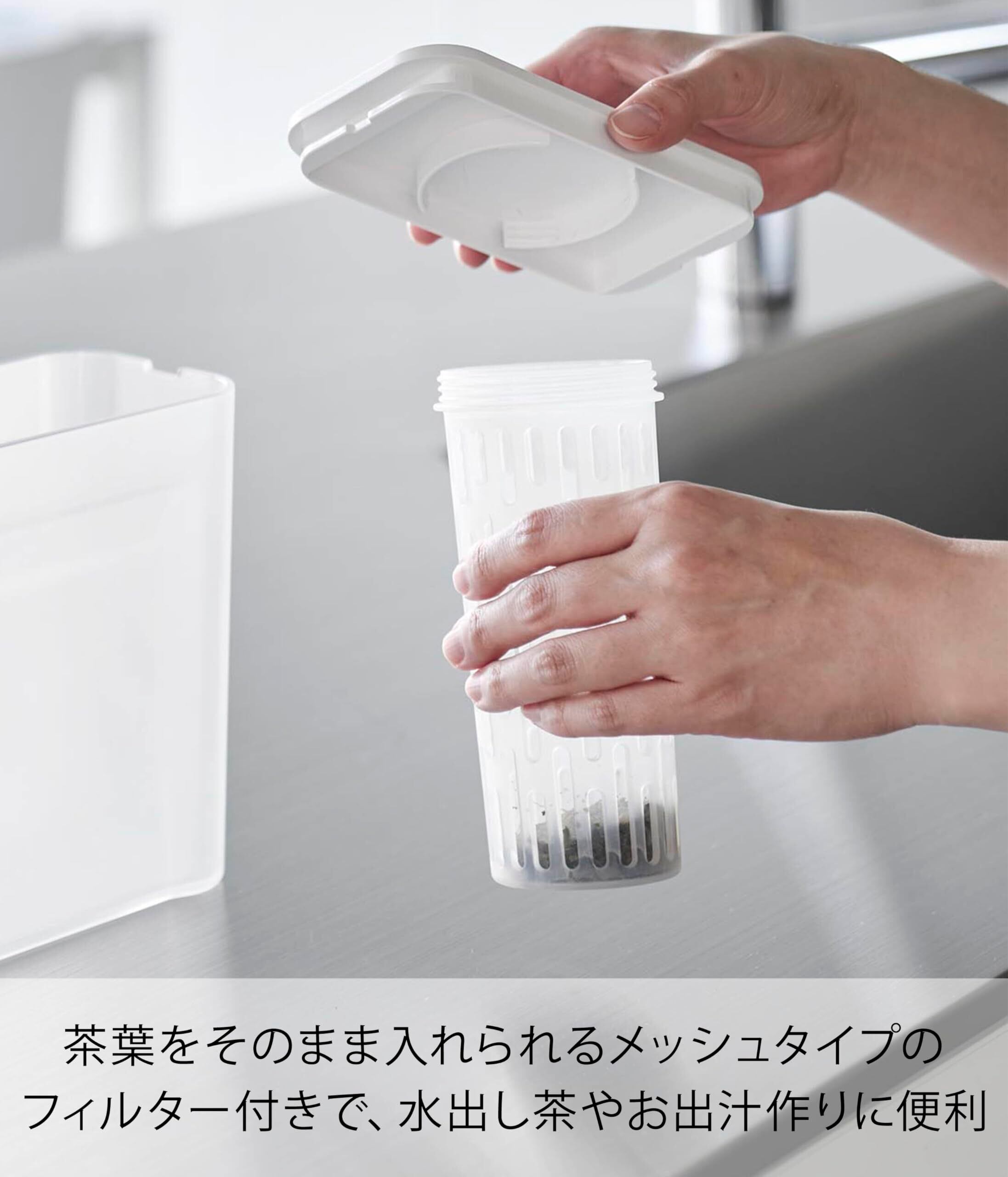 冷蔵庫の下段に収まるサイズで、茶葉をそのまま入れられるメッシュ製フィルター付きの冷水筒です。茶葉やお出汁を水出しする際、フィルターが底まで届くので少量の水でも抽出することができます。水出し後は、蓋側面のくぼみを容器の縁に引っ掛けることができるので最後の一滴まで注ぎきることができます。手が小さめの方でもしっかりと持ちやすい形状。開口部が広いので洗いやすく、食器洗い乾燥機で洗うこともできます。ドアポケットにも収納可能。冷水専用。食洗機OK。