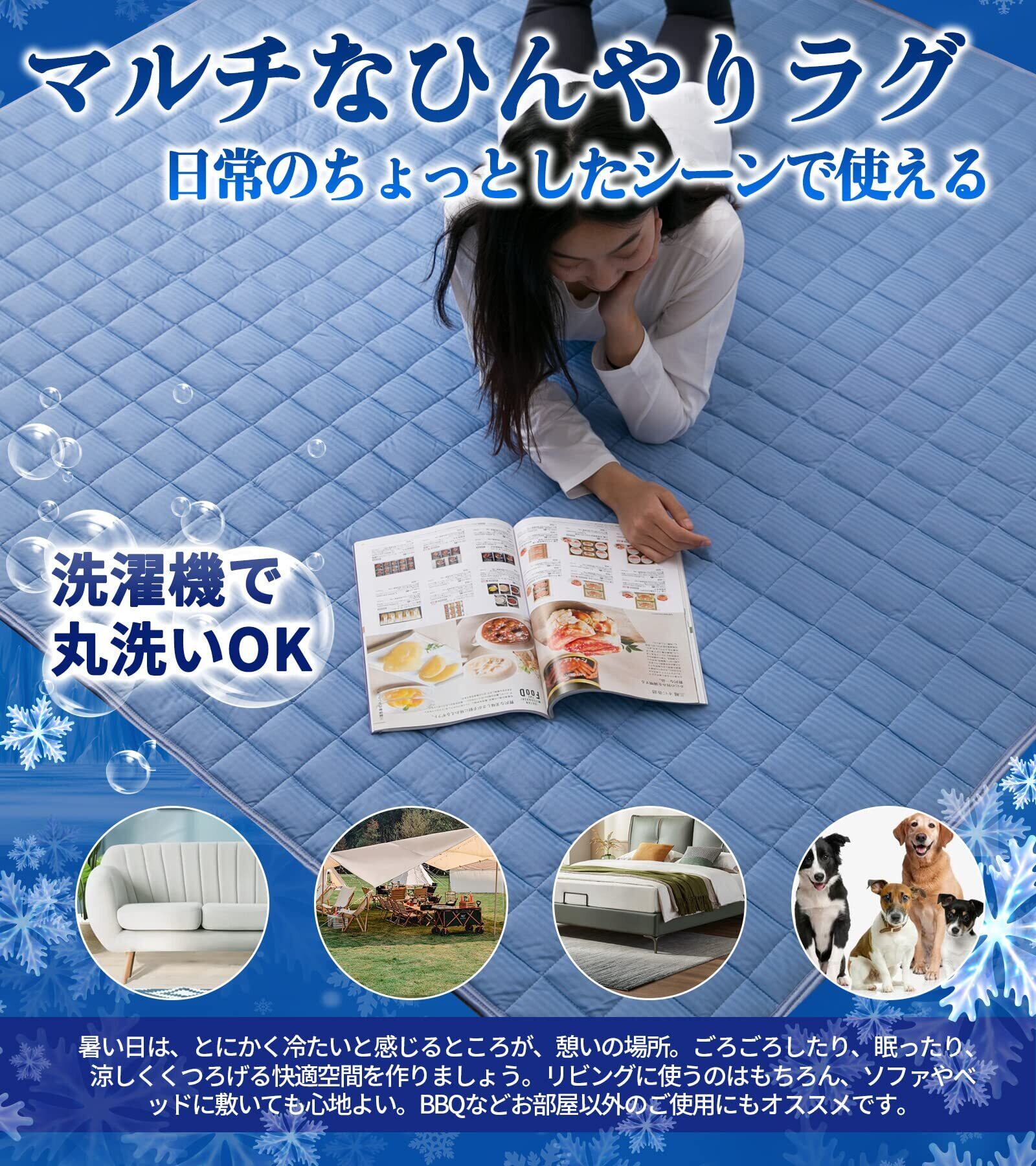 Lemon Bear 冷感 ラグ カーペット 夏用 ひんやり ラグマット キルトラグ 185×185cm(約2畳) 洗える ひんやりマット 接触冷感 ラグ 夏 ひんやりラグ 冷感 抗菌防臭 滑り止め付(185×185cm ブルー)
