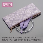 房は京都の伝統工芸である「京房ひも」の職人が製作した正絹頭付房を使用しております。小さいバッグにも収まりやすいコンパクトサイズの高級ファスナー式数珠袋をお付けします。