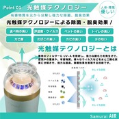 【7nmという日本ブランド名の由来】 ①これは光触媒として働く酸化チタンの粒子サイズ、7ナノメートルを指しています。この微細な粒子サイズが、除菌と脱臭の効率を高める要因となります。この「7nm」という数字は、私たちが目指す高い「空気品質」と「生活品質の向上」を象徴しています。 ②7nmブランドのSAMURAI AIRはコンパクトながら強力な空気清浄機能で、クラウドファンディングで548%の資金集めに成功した注目の製品です。