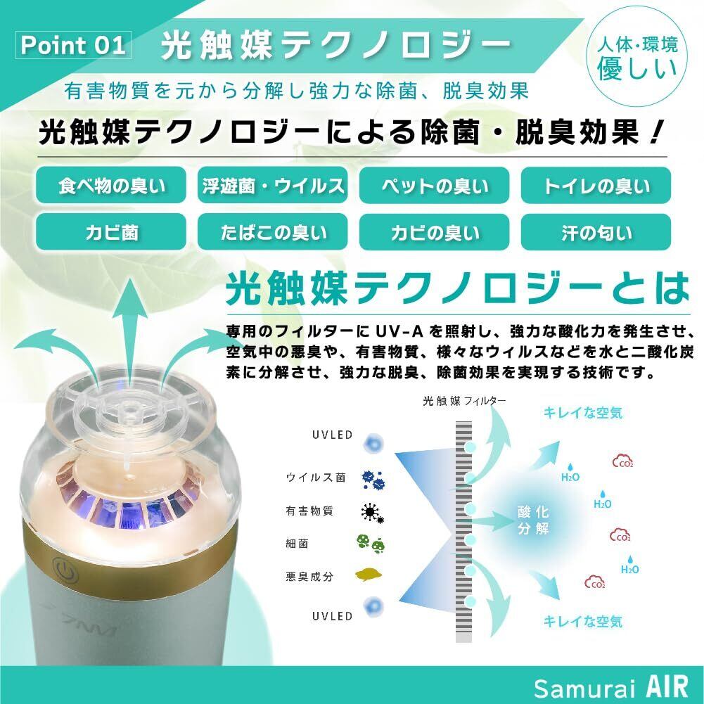7NM 日本ブランド 脱臭強化 空気清浄機【SAMURAI AIR】 車載 ポータブル タバコ 小型 光触媒 除菌 卓上 軽量 花粉 ウィルス抑制 コンパクト ペット 消臭 臭い HEPA フィルター付属(Gold)