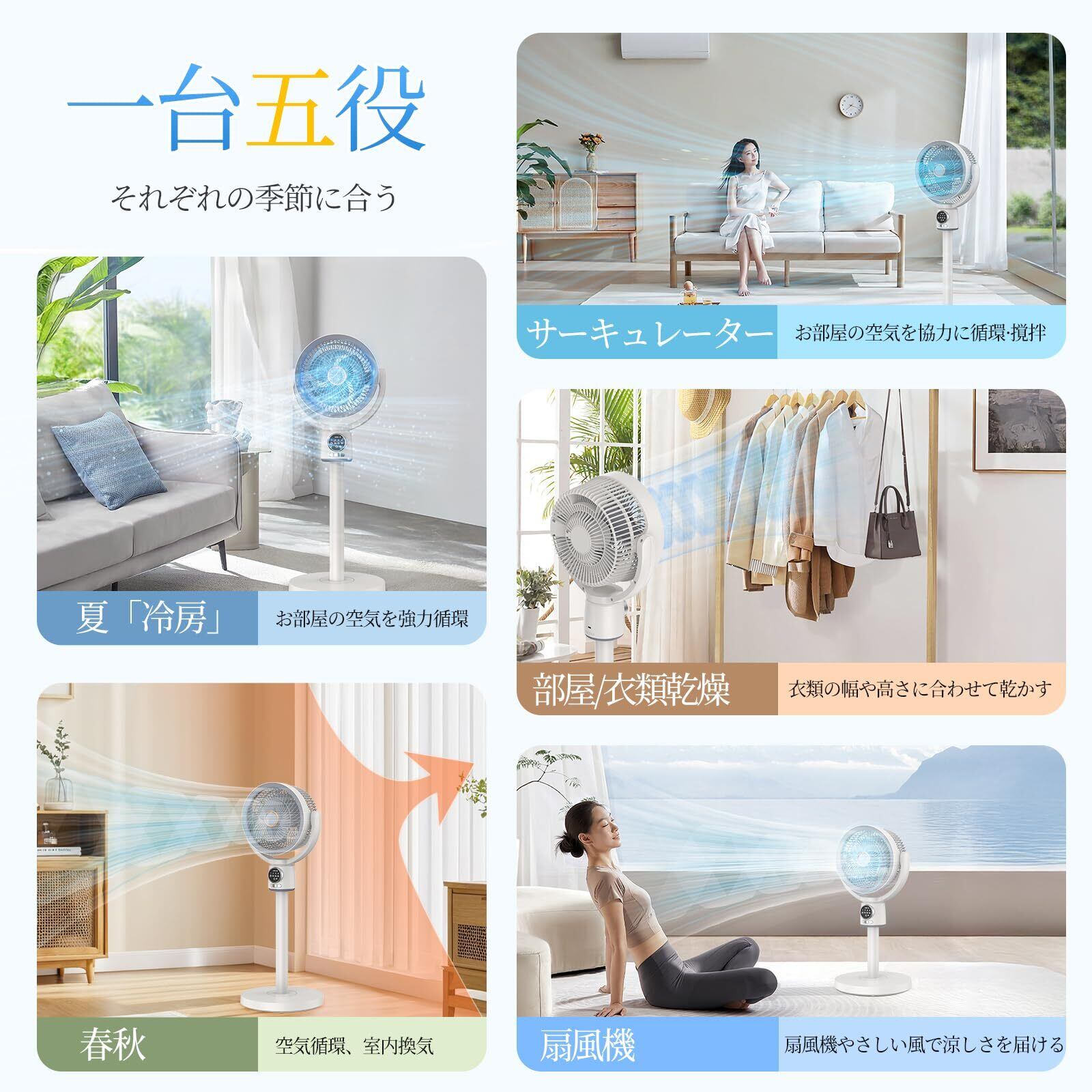 【2025最強モデル&節電対策】サーキュレーター 扇風機 兼用 自動首振り せんぷうき 風量5段階調節 DCモーター パワフル送風 静音 リモコン付き タイマー機能 4段高さ調整可能 一台5役 換気 空気循環 部屋干し 梅雨 除湿 衣類乾燥 日本語取扱説明書付き