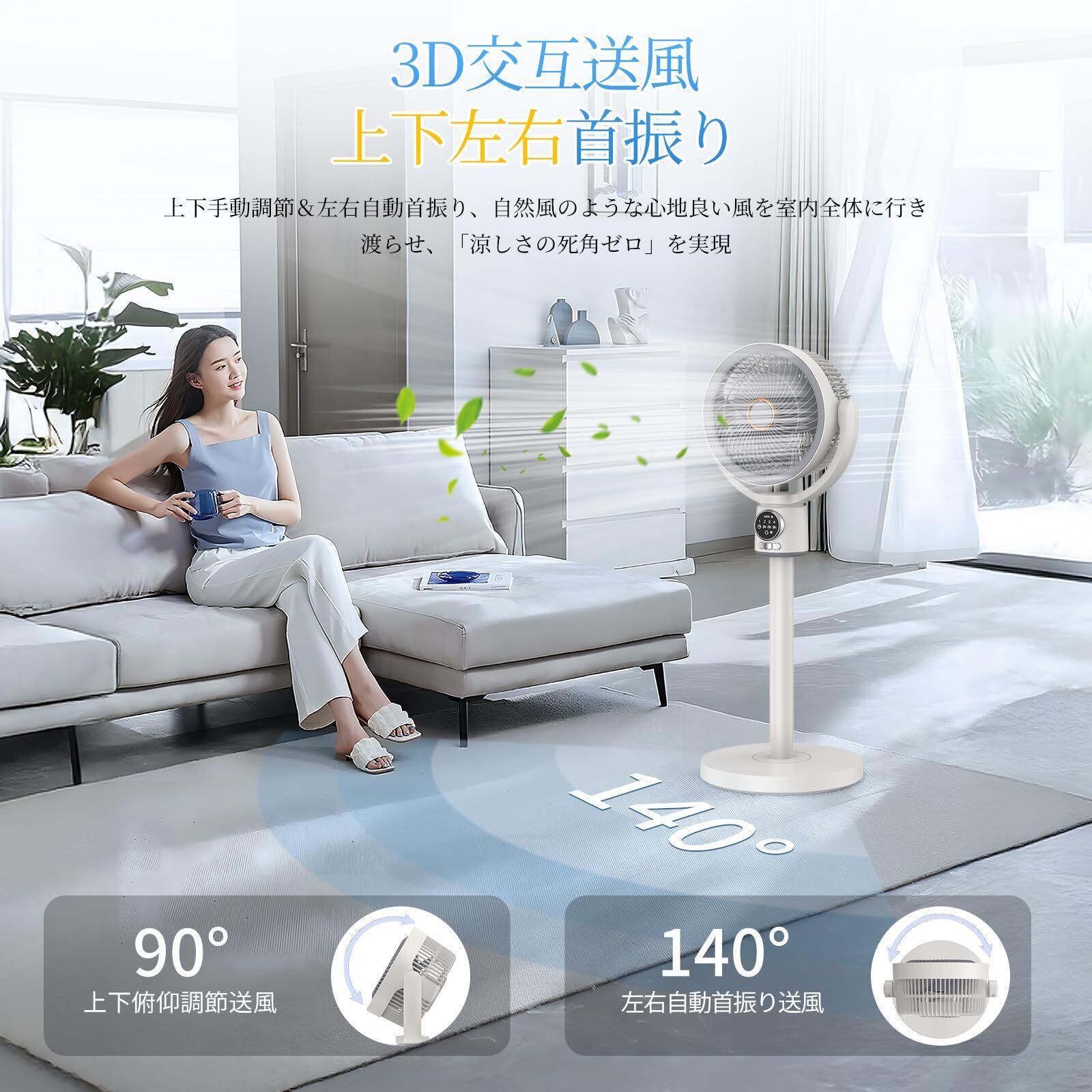 【4段階高さ調整&上下左右に首振り機能搭載】どんなシーンでも大活躍する、この多機能サーキュレーターは、36cm、52cm、68cm、86cmの4段階高さ調整が可能!スマートなスパイラルインターフェイスデザインにより、簡単に高さを切り替えられ、どんな部屋や状況にもぴったりフィットします。上下90°を手働で調節し、ピッチ角度を自在にして、手働で正確に送風します。左右140°自働首振り、組み合わせ140°超広角自働首振り、左右に広い空間を横切り、シームレスに隅々まで涼をカバーさせます!3D大広角の強い送風、伝統的なファンの限界を突破して、立体循環気流が部屋全体を横切ります!強力な風力に広角送風が加わり、サラウンド型のクールストームとなり、蒸し暑さを素早く吹き飛ばし、「死角なし」の爽快な体験が楽しめます。循環扇の中の「空間管理マスター」が快適な新次元を定義します!