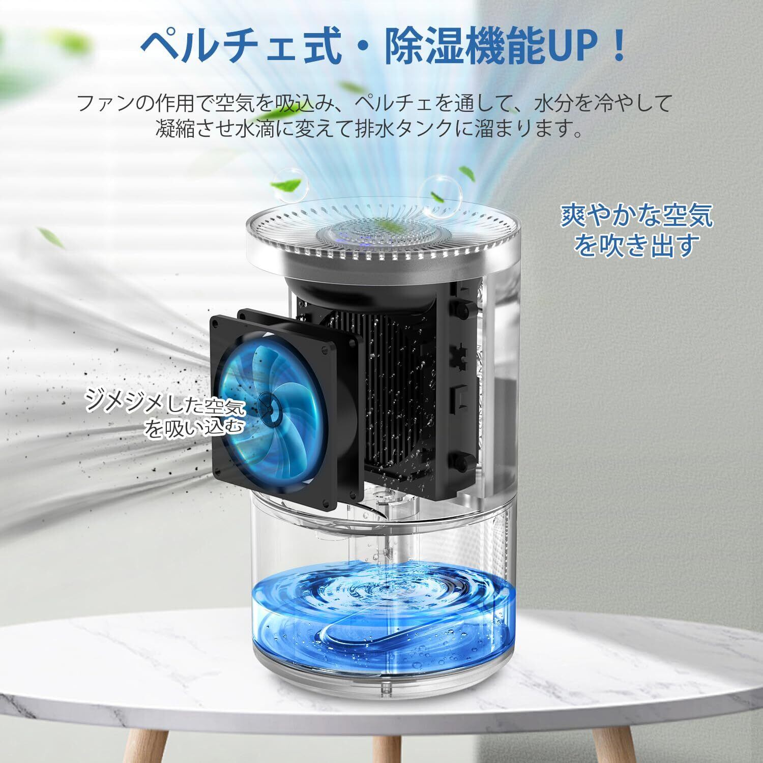 【強力除湿!結露/カビ/梅雨/家の湿気対策】1000ML大容量除湿機はペルチェ技術を採用しており、ペルチェ素子によって湿気を含んだ空気を冷却し、結露させて水滴にする仕組みになっています。1000ML大容量透明タンクで毎回の除湿量が一目瞭然! 除湿器は1日450mlの水が除湿でき(30℃、80%RHの環境条件)、高湿度の梅雨や夏の時に大活躍してくれます。湿気によるカビ臭や窓際の結露を予防することができ、これからジメジメした季節も爽やかな気分で乗り切れます。