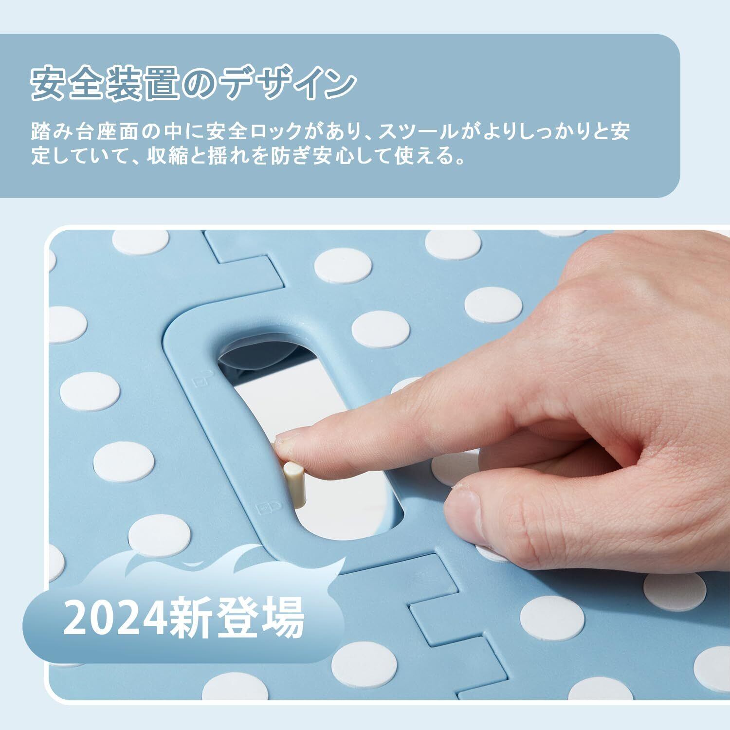 【安全装置のデザイン】踏み台座面の中に安全ロックがあり、スツールがよりしっかりと安定していて、揺れを防ぎ安心して使えます。 ロックを解除して折りたたんで収納します。