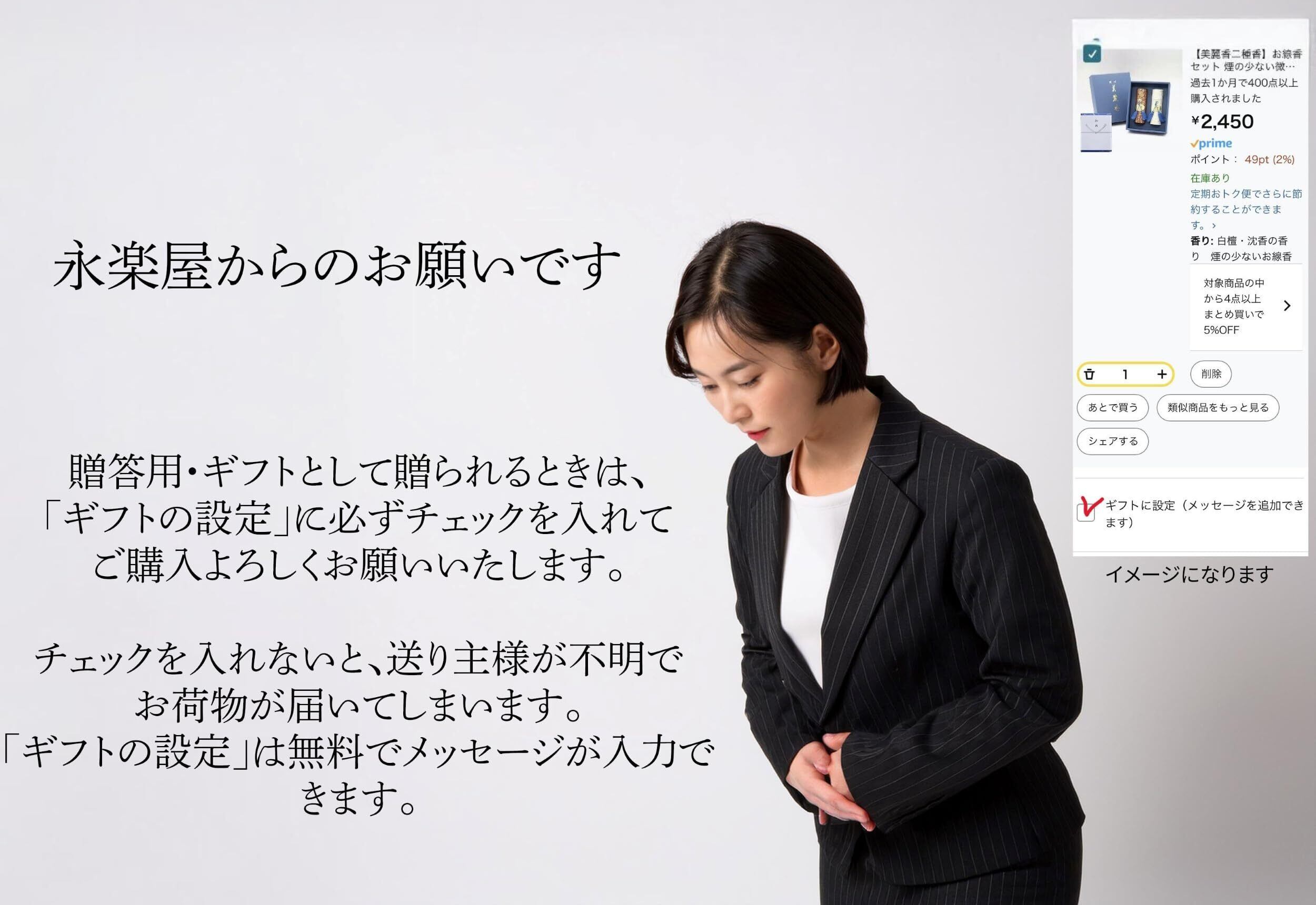 お悔やみの挨拶文付き。熨斗に貼り付けていない場合は、包装の内側に同封しております。ご安心ください。