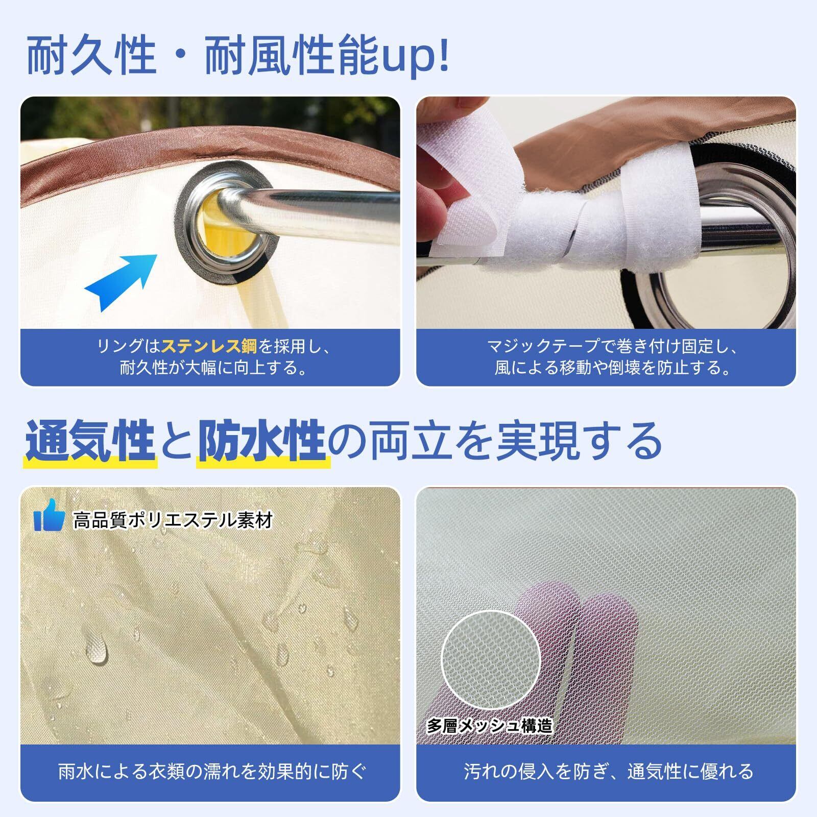 【通気性抜群】本社の洗濯物カバーは、上部は防水シート、下部は高密度メッシュの二層構造を採用。雨や花粉をブロックしつつ、風通しを確保することで、梅雨時や室内干しでも「洗濯物が生乾き臭くなる」悩みを解消します。特にアレルギー体質の方にとって、「洗濯物に付着した花粉による肌トラブル」を大幅に軽減。さらに、通気性の良さから夏場の高温多湿環境でもカバー内部が蒸れにくく、衣類の乾燥速度も向上します。