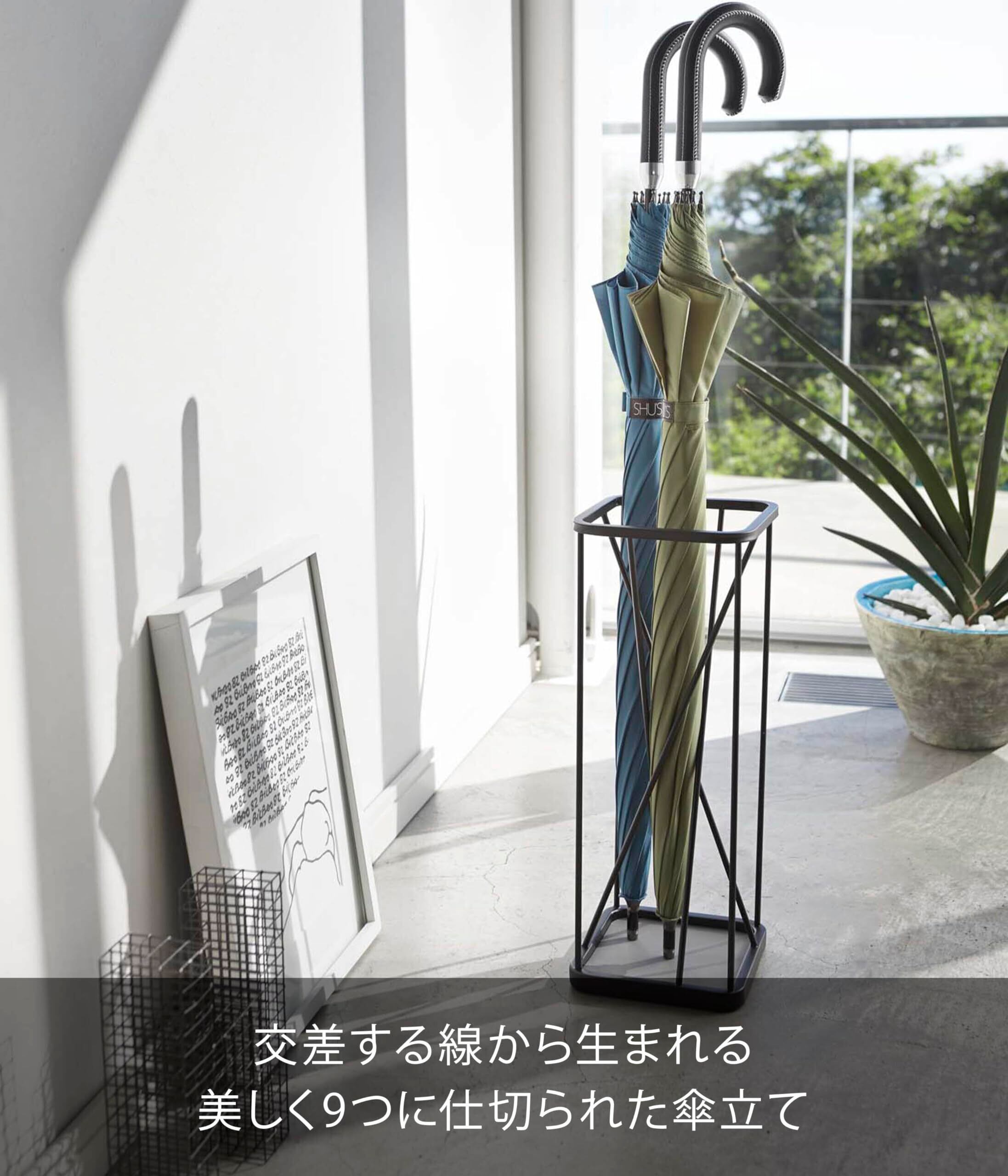 交差する線から生まれる美しく9つに仕切られた傘立て。上から覗くと仕切りが見えるアーティスティックなデザイン。交差する仕切りが傘をホールドする構造。