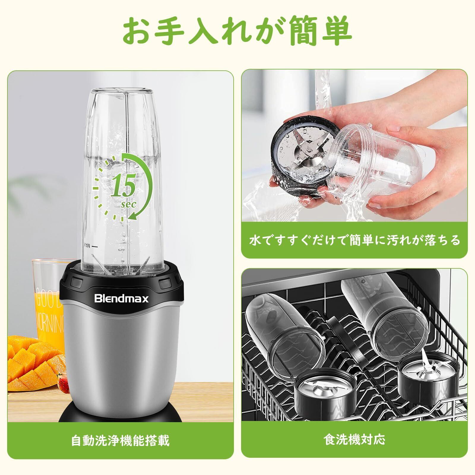 【使いやすい&お手入れ簡単】小型ミキサーはカップを押すだけで簡単に操作でき、わずか10~60秒でお気に入りの飲み物を手早く作ることができます。蓋も付いているため、蓋を閉めれば冷蔵庫での保管も可能です。また、ハンドブレンダーよりも安全で、ケガをする恐れもありませんし、飛び散りの心配もありません。初心者でも簡単に操作できる設計です。ケガをする恐れもございません。ミキサーについてお手入れでお困りの方が多かったので、本製品は取り外して細部まで水洗い可能です。カッターの刃と台座が外せるため、細かい汚れもしっかり落とせます。細かく分解できるので簡単かつ衛生的です。忙しい毎日でも、スムージー生活がおいしく続けられます。