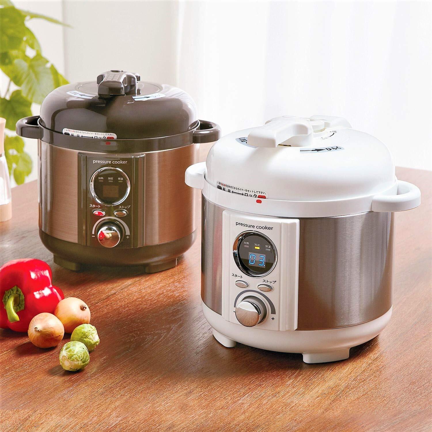 ◎<商品説明>カラー:ブラウン。材料を入れてタイマーをセットするだけの簡単調理。ガス火式の圧力鍋と違い難しい火加減や時間を計る手間は不要です。ガス火式の圧力鍋の不満を解消!少人数用にピッタリな、コンパクト&シンプル操作の電気圧力鍋。内鍋・蓋は取り外しができ丸洗が可能なので、清潔に使用する事ができます。 サイズ:(約) /幅26.8×奥行26×高さ25.5cm 重量:約2.7kg コード長:約1.5m 電源:AC100V 50/60Hz 消費電力:600W 調理容量:調理MAX (1.2L)、豆類 MAX (0.6L) 材質:PP / ステンレス